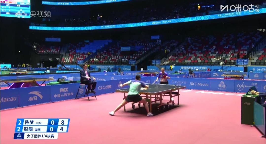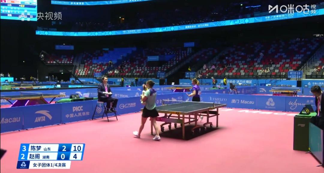 全运会乒乓球女团四强黑龙江、河北、上海、山东! 18:00半决赛 山东队的两届奥运会团体、单打金牌得主,2025全运会单打铜牌获得者陈梦,拼了! 正在为山东女团晋级四强而奋力拼搏! 山东Vs湖南 第一盘:陈梦/王晓彤1:3胡丽梅/朱思冰,不敌湖南“双削”组合! 第二盘:范思琦3:0赵阁 第三盘:王晓彤3:0朱思冰 第四盘:范思琦2:3胡丽梅 第五盘:陈梦3:0赵阁 山东女团双打失利,开门黑! 双打损失,单打补! 陈梦,王晓彤,范思琦一人一分! 关键是决胜盘,陈梦背水一战,她这一分拿不下来,前功尽弃! 陈梦3:0赵阁 女团山东队3:2胜湖南队 这场马拉松式的比赛耗时3小时20分! 11月18日 18:00 女团半决赛 上半区 黑龙江Vs辽宁 下半区 上海Vs山东