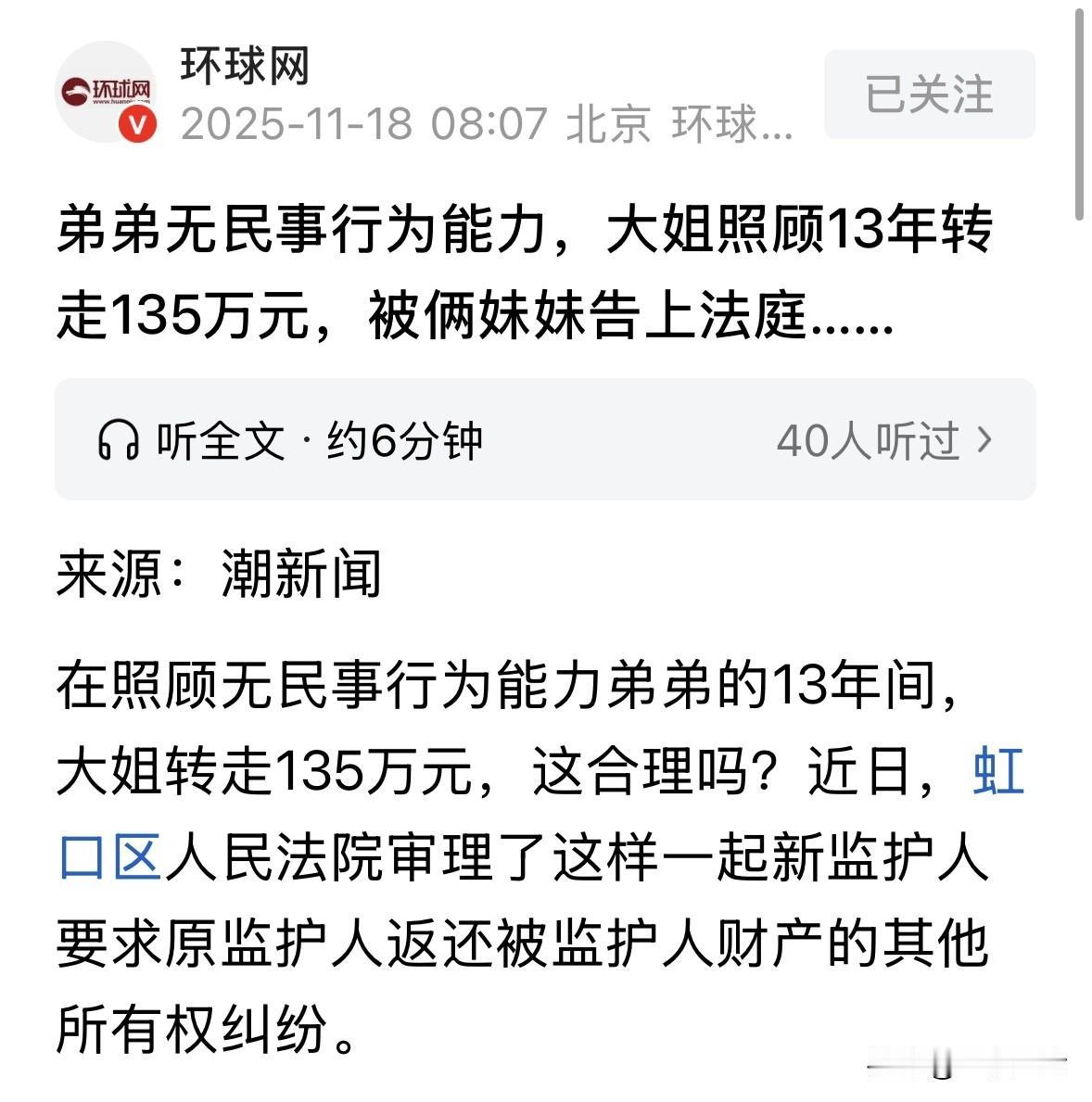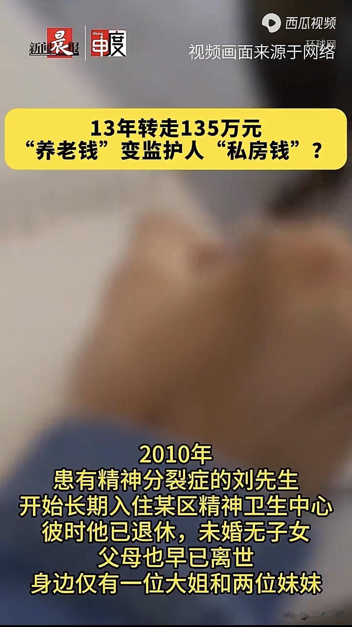 上海,男子患精神分裂,常年住卫生中心,身边只有一个大姐和俩妹妹,男子每月领5000退休金,还有一笔不小的积蓄,他的财产全部由大姐掌管,后来,仨姐妹因为父母财产分配的事彻底闹掰,俩妹妹就申请变更为监护人,接管男子财产后俩妹妹惊讶发现,过去13年,大姐竟从男子账户里转走135万,她们诉至法院,对此,大姐的解释亮了。 2010年,患有精神分裂症的退休工人刘先生搬进了某区精神卫生中心。 他孑然一身,未婚无子,父母也已离去,只剩一个大姐和俩妹妹。 刘先生虽在病中,但经济上还算安稳,他每个月能领5000多的养老金,单位部分报销的护理费,再加上零零碎碎的车贴、残疾补助、敬老卡津贴,每月进账不少。 更难得的是,他患病前勤俭半生,攒下了不小的积蓄,足够让他安然度过后半生。 13年光阴,刘先生躺在病房里,在亲人的扶持中度过。 起初,姐妹仨人有商有量,决定由稳重的大姐一手接管刘先生所有银行账户、存折和各类证件,日常开支一笔一笔也由她记在账上。 俩妹妹对大姐也是信任有加,13年间从未对大姐的管家权提出半分质疑,仿佛这本就是天经地义,是大姐辛苦照料该得的体面。 然而,到了2023年,原本关系还不错的姐妹仨,在父母遗产分配的问题上爆发了矛盾。 几番对簿公堂后,姐妹仨人的关系彻底破裂了,这时,她们齐刷刷把目光聚集到了终于刘先生的财产上,这钱还谁来管理,怎么管理,成了彼此攻讦的新战场。 信任既已粉碎,2位妹妹随即向法院出手:申请宣告刘先生为无民事行为能力人,并力主由她们接手监护职责。 法官审理发现,大姐经手刘先生账户资金流水中,取现频繁,甚至存在公私账户界限模糊的隐患。 在刘先生财产明细本身尚未厘清的情况下,相对置身事外的妹妹们,似乎成了眼下更合适的管理人选择。 最后,法院敲下法槌,宣告刘先生无民事行为能力,指定2位妹妹为监护人。 监护权移交了,银行存折和账户也交到了妹妹们手里。然而,当她们真正翻开旧账,一行行数字令她们倒抽一口冷气… 13年间,大姐从刘先生账户里提取和转走的钱款,竟累积达到135万! 2个妹妹以兄长代理人的身份,愤然起诉大姐,要求她全数吐出这笔巨款。 法庭上,俩妹妹质问道,这钱,多少是真正花在我哥身上了?绝大部分都被大姐揣进了自家口袋! 大姐的反驳称,我每月接他出来住,用的是他的积蓄租房,那房租一年比一年高,你们谁算过?还有他的日用花销、看病、其他房子的物业费……哪一样不是我默默贴钱撑着? 她更指妹妹当了监护人后才查旧账,说要告也只能告今年的账,我还得问你们要证据证明我私用了钱呢! 法官将争议聚焦于一点:大姐过去多年处分刘先生财产的行为,究竟是否越界?如果越界,又该退赔多少? 首先,刘先生的日常开销并非无底洞。他长年居住精神卫生中心,原有单位护理费报销政策加上稳定的退休金,已足以覆盖其常规生活需求,外出就医、居住或家属探望等额外开销。 大姐提出的律师费、诉讼费、装修费等大项开支,都没有可靠票据支撑其真实性与合理性,可以说记账混乱的像一团乱麻。 大姐和她的家人长期占用刘先生租金租住的房屋,甚至动用他的积蓄数十万装修,即便刘先生后期身体恶化无法外出,她们依旧占据该屋,租金照旧由病人账户支付。 同时,另一套本供刘先生偶尔外出休养之用的房屋,竟也被大姐拿去出租牟利。 凡此种种,早已逾越了监护职责所划定的“为被监护人利益”的边界。 13年间,刘先生从医院外出的次数仅有66次,每年看病也就6到8趟。就算把所有可能的聚餐花费都算上,合理开支的总量也绝对有限,更不可能全由刘先生一人承担。 在这个背景下,135万这个庞大数字早已突破了合理性的边界,大姐对刘先生财产权益的侵害,昭然若揭。 那么,从法律角度,怎么看待这件事? 《民法典》第35条规定:监护人应当按照最有利于被监护人的原则履行监护职责。监护人除为被监护人利益外,不得处分被监护人的财产。成年人的监护人履行监护职责,应当最大程度地尊重被监护人的真实意愿,保障并协助被监护人实施与其智力、精神健康状况相适应的民事法律行为。对被监护人有能力独立处理的事务,监护人不得干涉。 大姐在2010-2023年期间实际履行监护职责,但她的行为存在多处越界。 大姐将刘先生账户资金用于支付自己及家人长期居住的房屋租金、装修费用,甚至在刘先生无法外出期间仍占用该房屋,并将刘先生名下另一套房屋出租获利。 这些行为明显超出“为被监护人利益”的范畴,构成对监护职责的滥用。 最终,法院衡平考量各项因素,一锤定音:大姐对她处分财产行为的正当性未能充分证明,尤其大额花费严重缺乏凭证,她的行为确已构成侵害。酌情判决大姐向原告刘先生返还人民币70万元。 自此,这场纠纷尘埃落定,无人上诉。 对于这件事,你怎么看? 欢迎关注@一案一论
