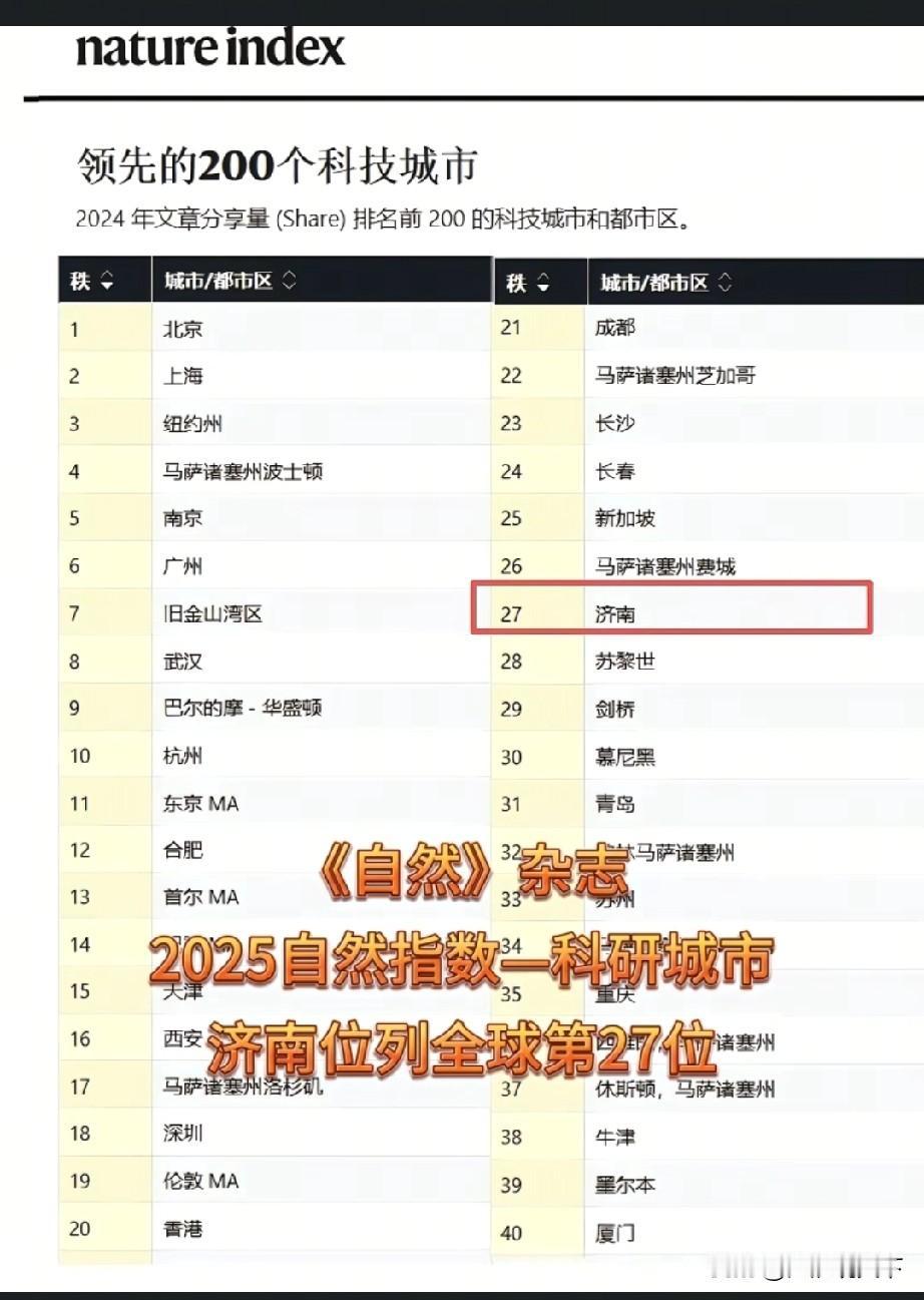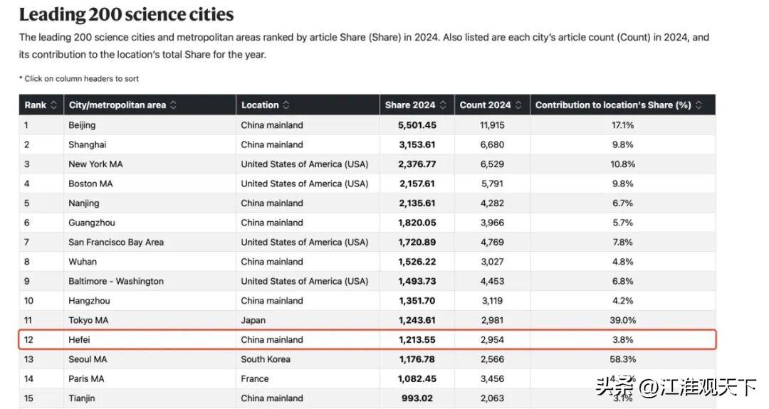 合肥位居全球科研城市第12名,非常高的排名了 经济日报,中国新闻网,合肥日报等媒体报道,2025自然指数全球科研城市榜单公布,中国有6个城市进入十强榜单,分别是:北京,上海,南京,广州,武汉,杭州。 安徽省合肥市位居全球科研城市第12名,比上一年提升了3个位次,已经距离十强榜单非常近了,也是排名非常高了。 目前各种官媒大多只报道前十强城市名单,其中中国6城市进入十强还上了热搜,前三十榜单,天津,西安,深圳,香港,成都,长沙,长春,济南等都有入榜。合肥GDP增速 合肥经济增长 合肥城市竞争力 合肥现状 合肥现状 合肥实力 科技城市排名