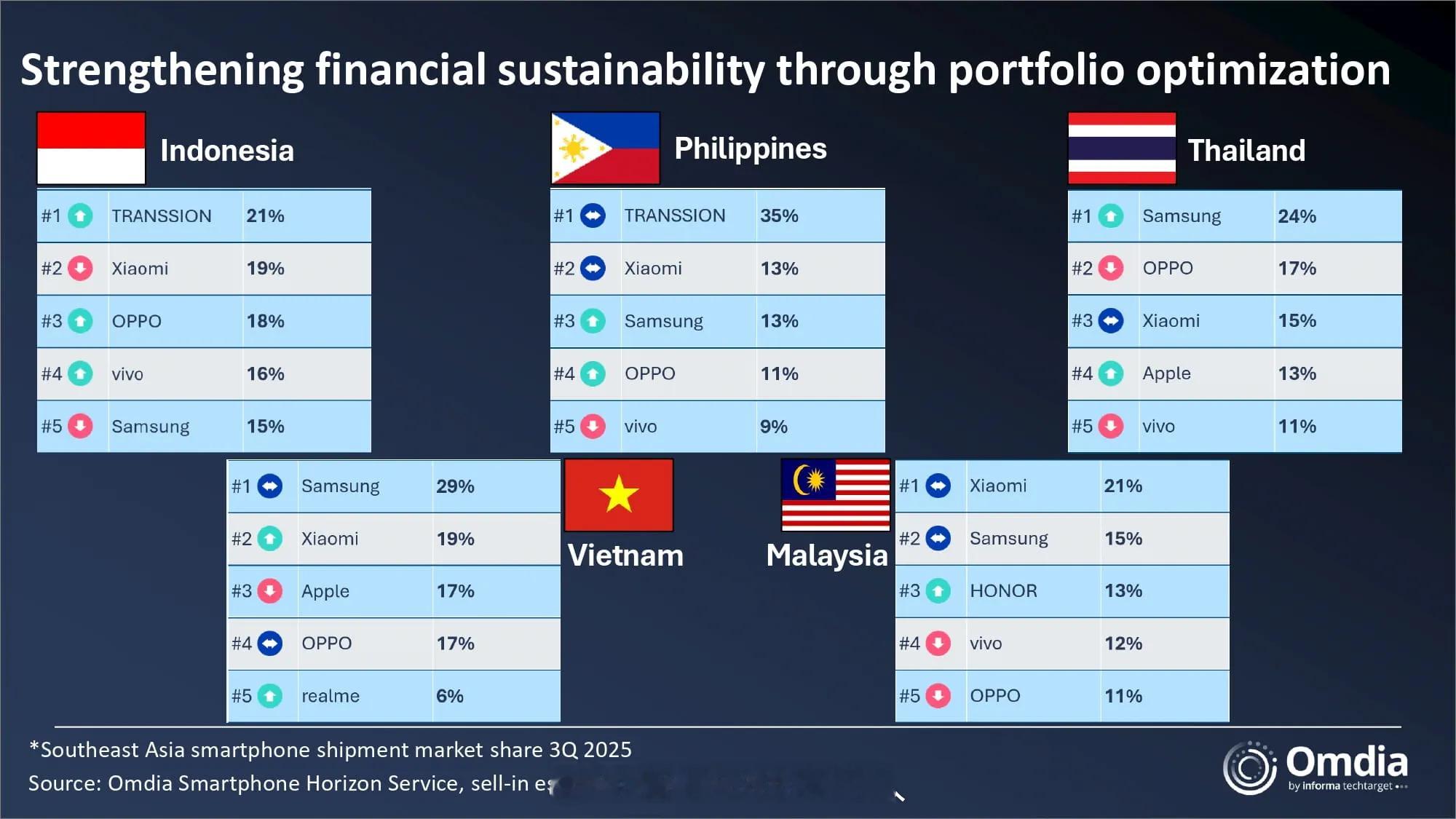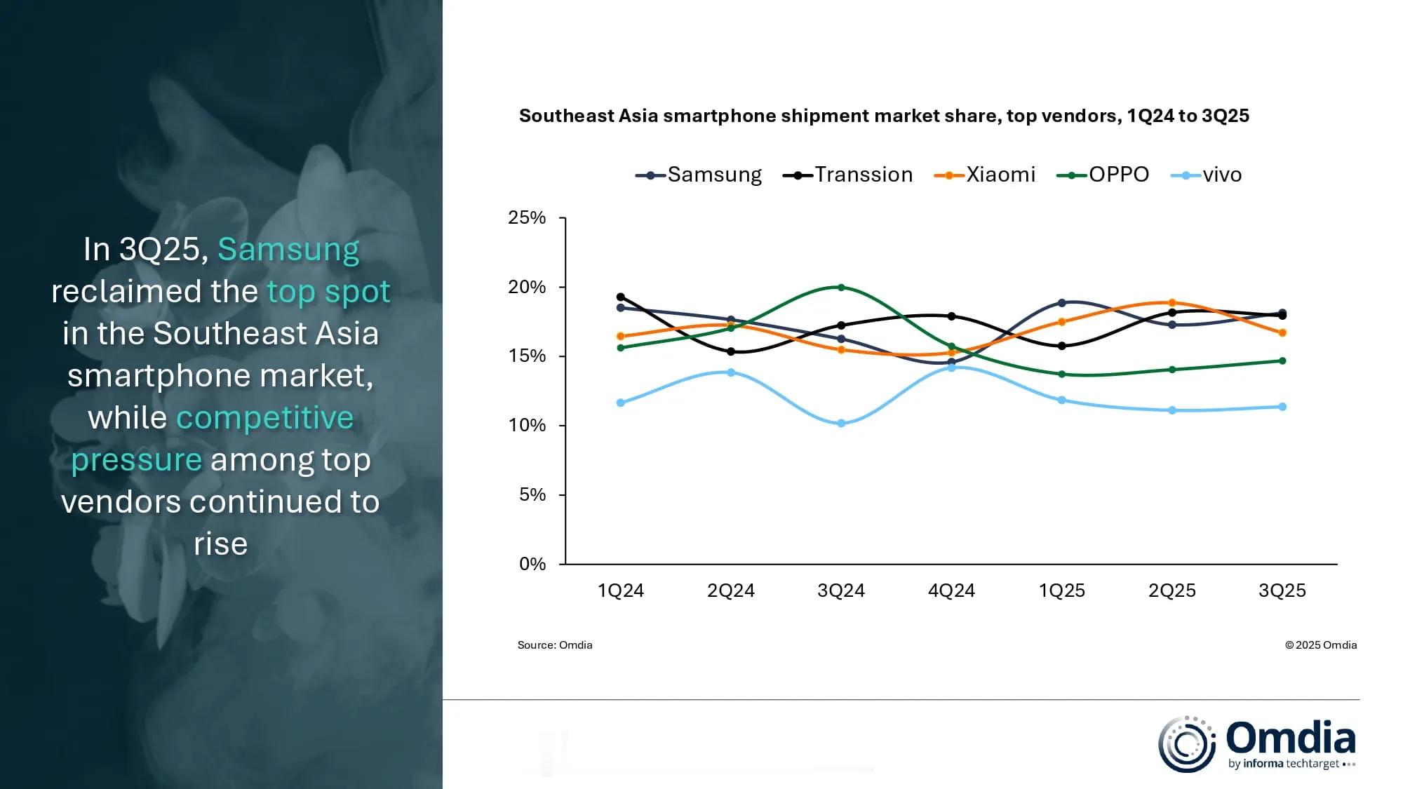 Omdia数据,25Q3东南亚手机市场销量同期减少1%,达到2560万部。Top3厂商,三星和传音相差很小,都是460万左右,领先小米的430万。