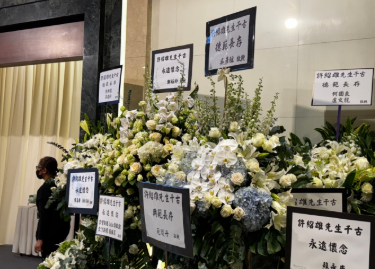 灵堂外放满不少圈中好友致送的花牌,包括成龙、古天乐、林峯、郑裕玲、吴彦祖、苑琼丹、宣萱、钱嘉乐、苏永康等