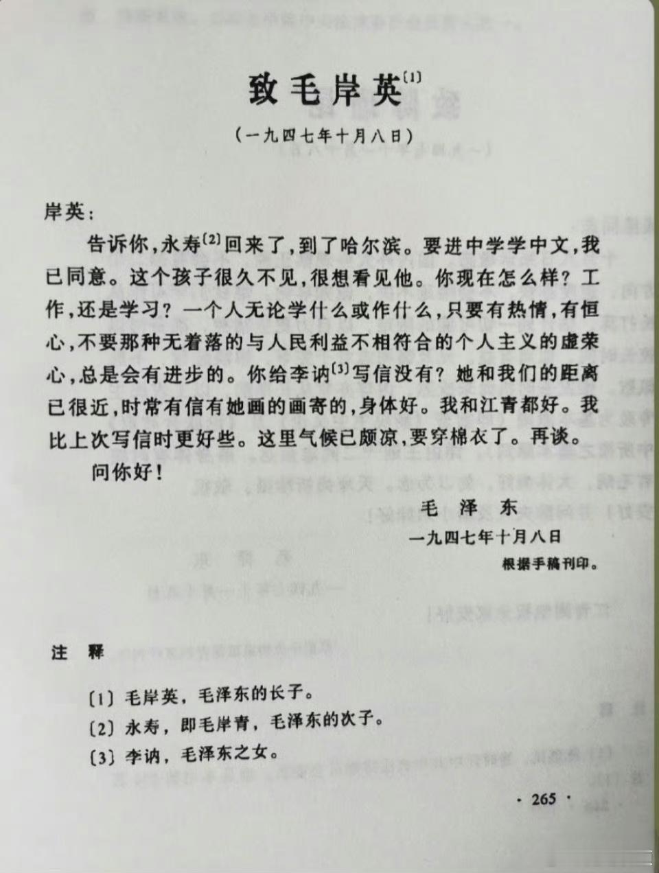 毛主席写给儿子毛岸英的一封信,看完很让人感动。