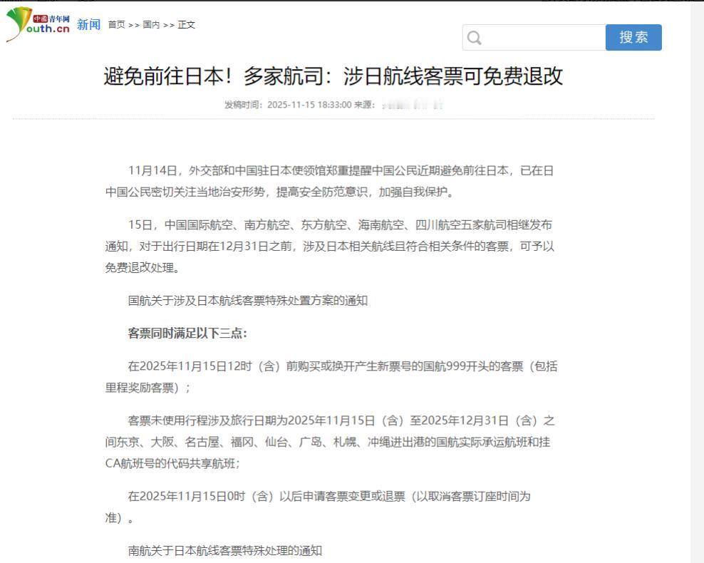 没想到中日关系恶化的这么快。14日晚上外交部才刚刚提醒中国公民近期避免前往日本,15日国内包括国航、南航、东航、海航、川航、厦航在内的多家航空公司集体宣布,日本航线机票可免费退改! 短短几天内,中日之间的互动出现了一系列让人始料未及的变化,从官方表态到市场反应,每一步都牵动着各方神经。 两国之间长期存在一些绕不开的分歧,比如对过往历史的不同看法,以及部分领土的归属问题,这些分歧一直像一层薄雾,笼罩在双边关系之上。而近期第三方势力的介入,让原本就复杂的局面变得更加微妙。 美国持续强化与日本的合作,日本亦借此在涉中国核心利益问题上屡屡生事。如此行径,不仅有违国际关系基本准则,更致使中美、中日间的分歧进一步扩大。 日本新任首相高市早苗的一系列言行成为了导火索。她在国会公开表示,“台湾有事” 就等同于日本面临 “存亡危机”,这样的说法一经传出便引发广泛关注。 更值得留意的是,她不仅未收回那番言论,还言辞凿凿地宣称,此言论代表政府立场。其这般作为,着实发人深省,引人探究背后深意。 此前,她曾会晤来自台湾的相关人员,甚至为 “台独” 分子授勋。这一系列行径严重违背一个中国原则,极大地损害两岸关系,是影响双边关系的关键负面因素。 面对当下局势,11月14日晚,中国外交部发布旅游提醒。出于对公民安全的审慎考量,建议近期中国公民尽可能避免前往日本,以策安全。这一官方发布的信息,被外界视为对当前局势的明确回应,也让大家感受到了局势的特殊性。 不到 24 小时,国内六家大型航空公司就做出了同步反应,纷纷宣布截至年底前,所有未使用的日本航线机票都可以免费办理退改。 这六家公司包括国航、南航、东航、海航、川航和厦航,如此整齐划一且迅速的动作,显然超出了常规的商业调整范畴,是对官方信号的直接呼应。 经济层面的连锁反应也随之而来。日本不少关键行业对中国市场的依赖度一直很高,比如稀土供应,日本有六成左右需要从中国获取;在半导体领域颇具影响力的东京电子,其营收中来自中国的部分占比几近四成,凸显了中国市场在其业务版图中的重要地位。 部分日本企业为维系此类合作,颇费心思地采取迂回策略,借助东南亚地区开展曲线采购,以此来保障合作关系的延续。一旦贸易往来受到影响,这些行业的数十万从业者以及相关关联产业都可能受到冲击。 而此前刚刚在中国市场恢复销售的日本海鲜,处境也急转直下。原本已经摆上超市货架的产品,不得不开始打折促销,中国的进口商们也纷纷暂停了新的采购订单,不愿在这个时候承担风险。 相关统计表明,日本海产品出口或因此折损约三成出口额。此现象亦让众人明晰,两国的经济合作,自始至终都难以脱离政治互信这一坚实支撑。 更值留意的是,此番关系之变所衍生的影响,或许并非局限于双边范畴,其涟漪效应或会扩散至更广阔的领域。 作为东亚地区的两个重要国家,中日之间的互动变化,很可能会引发区域安全方面的连锁反应,极端情况下,甚至可能导致军备方面的竞争或者安全困境,给整个地区的稳定带来不确定因素。 这些接连发生的事情,都在传递着清晰的信号,双边关系的走向,始终离不开对彼此核心利益的尊重和政治互信的构建。