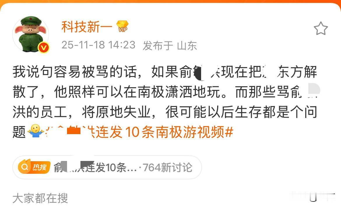某博主:“我说句容易被骂的话,如果俞某某现在把某东方解散了,他照样可以在南极潇洒的玩,而员工就失业了[捂脸]” 就在刚才,知名数码博主在社交网络,表达了大家对某某东方某某创始人,在南极玩这个事情相反的看法[捂脸] 因为这两天这个创始人在南极玩的时候,发了他们公司周年的内部信,有人说他们员工和老板没有多少共鸣,毕竟老板正在南极潇洒的玩,而员工正在加班,所以他们心里面不是很平衡。 但是这个博主也是做了10多年的老板,他认为有这种想法其实不是很理智的,因为就按照员工的想法,把这个事情往前推一步,结果就能看出来了,那就是这个老板依然可以在全世界任何地方潇洒的玩,但是这些员工可能马上就失业了。 当然,他说这个话可能会引起很多人的不满,但是他表示自己其实就是说了一个事实,所以大家不要看到人家享受生活或者怎么样,就引起生理上或者心理上的不适,与其这样,还不如自己好好努力把工作干好,多挣点钱,能够像老板一样自由的玩,或者有本事就自己单干。 这些话听起来有点残酷,看起来也比较现实,但这个世界的底层运行逻辑,好像就是这样的,但有时候就是这样,大家即便是看到事实,也不希望人家把这个点说穿了[捂脸][捂脸],谁说穿了谁就会挨骂,所以这个科技博主注定又要被挨骂[捂脸]