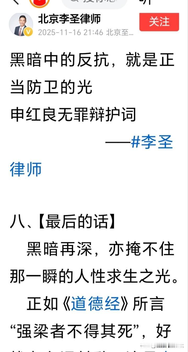 李圣说,“黑暗中的反抗,就是正当防卫的光”。网上还有人黑李圣律师,有的拿他被打说