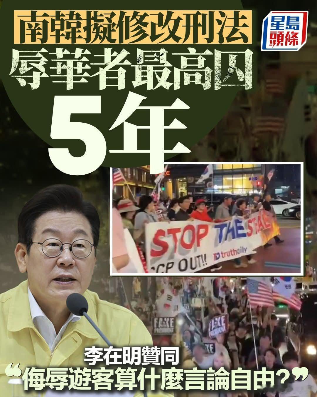 韩国拟修改刑法,辱华者最高囚5年韩国早前爆发大规模反华示威后,有国会议员提案,提议侮辱中国者最重可判囚5年,总统李在明总统也表示赞同。执政共同民主党议员杨富男本月4日提案修改刑法,规定不得诋毁特定国家、国民及种族,毁谤罪成立者可处5年以下徒刑或罚1000万韩元(约4.85万人民币),公然侮辱者可处1年以下徒刑或罚款200万韩元(约9700人民币)。杨富男表示,之所以要立法是因为10月3日的反华示威,有人唱歌肆意谩骂「中国人、朝鲜傀儡、赤色分子快滚」,并散播中国介入选举等假消息。南韩目前法律仅处罚侮辱并诋毁名誉的个人,修法后范围将扩大到团体。共同民主党高层表示,虽然不会立即推动,不过党内已对修法达成共识。总统李在明也说:「辱骂、侮辱特地国家的游客,是想故意恶化关系,算什么言论自由?根本就是捣乱。」