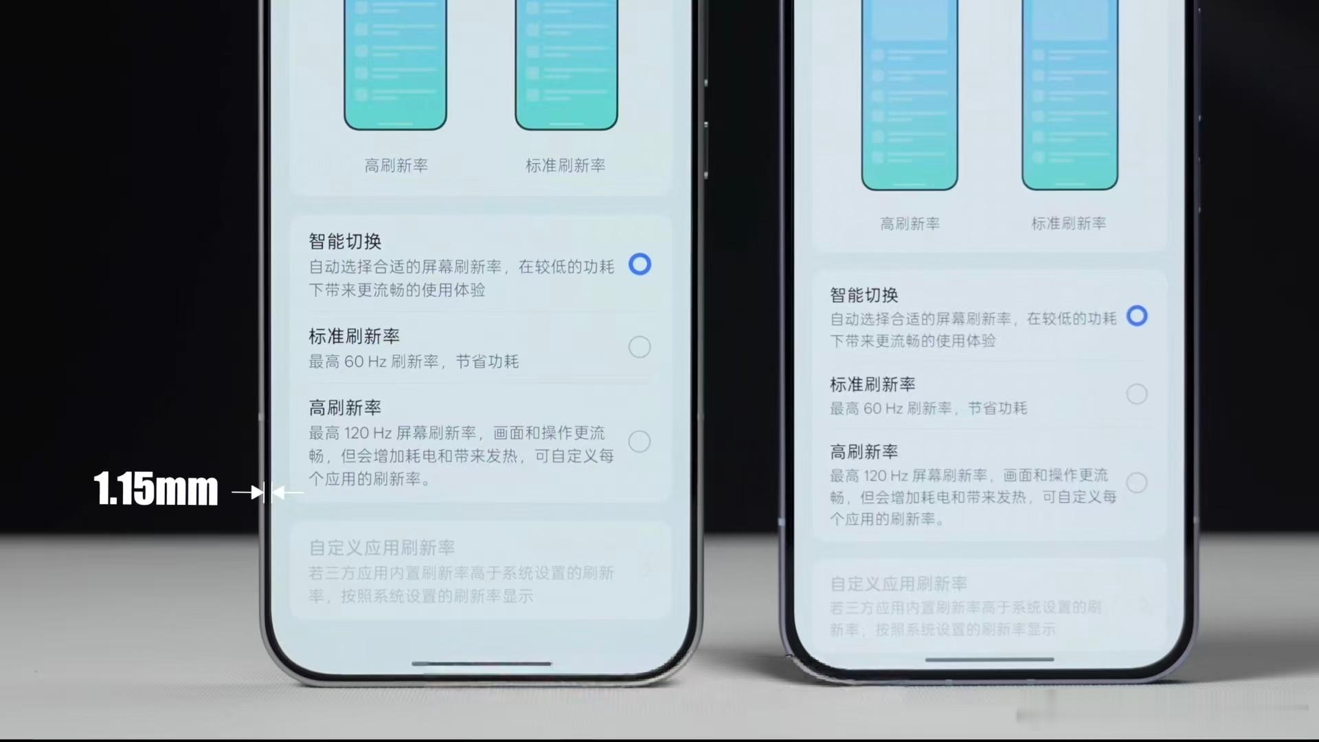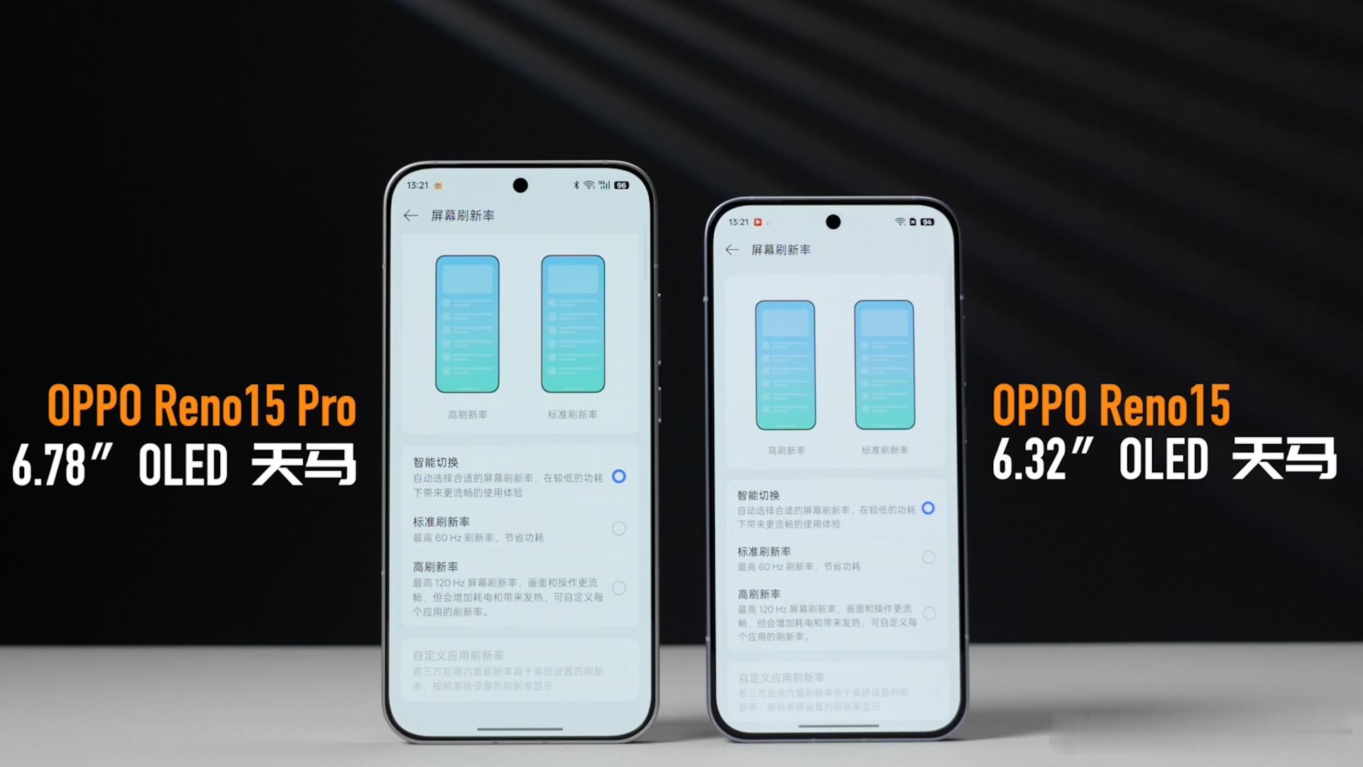 安卓旗舰集体果化,那中端机咋做?OPPO坚持OPhone策略,比起Find,Reno后盖做了光晕设计,且摄像头几乎不凸起;荣耀数字产品线,跟进iPhone Air外观,做续航更强焦段更全的二代Air;vivo S50还没曝光,等等看。目前发布的只有Reno15系列,标准版6.32小屏、Pro则是6.78大屏(图3)。两者区别:1、标准版LTPS、Pro版LTPO;2、如图,Pro边框更窄(图4);3、重量和厚度(187g+7.99mm、205g+7.5mm)。相同点:金属中框+玻璃背板+冷雕工艺(图5)。可以认为:屏幕尺寸,带来重量/厚度的变化。所以这两机型也好选,小屏看标准,大屏选Pro,记住了不?