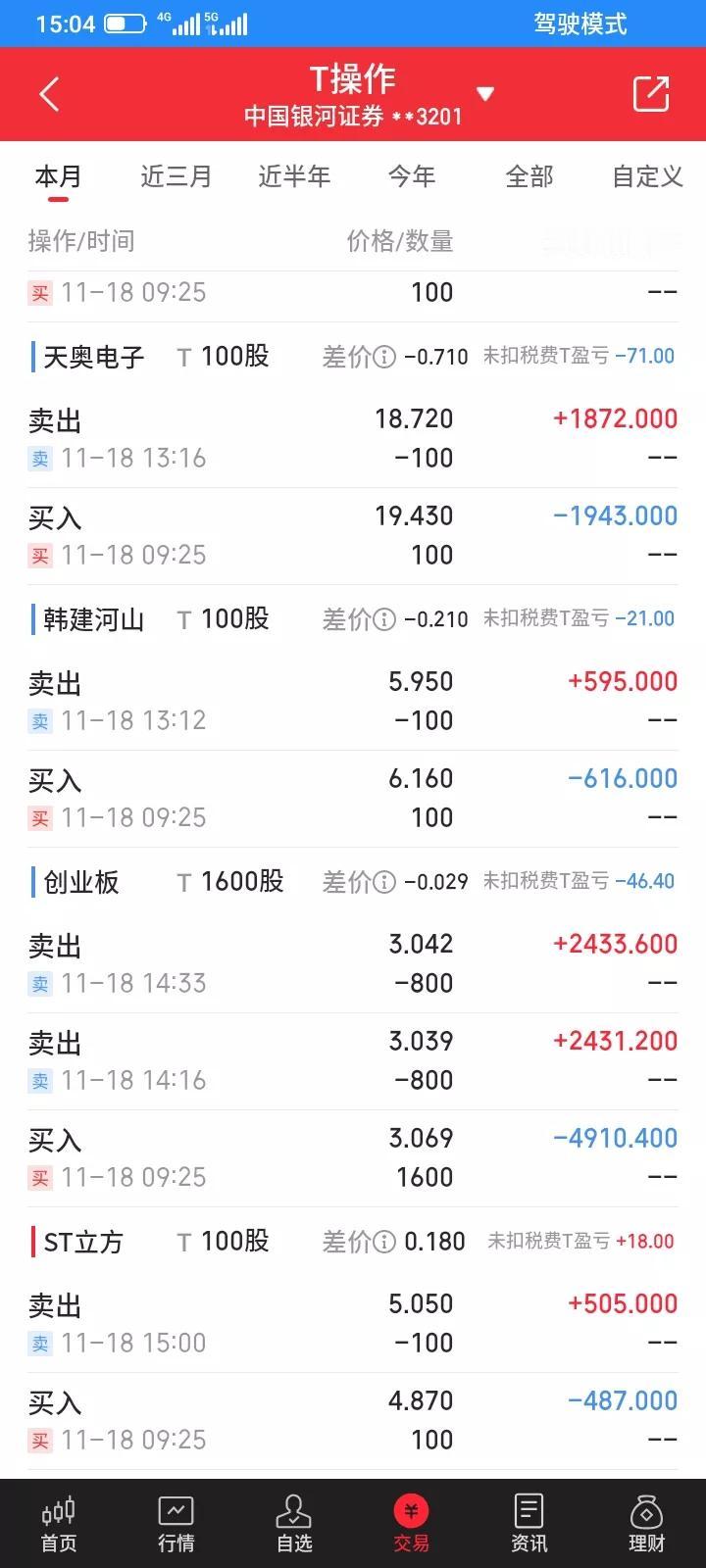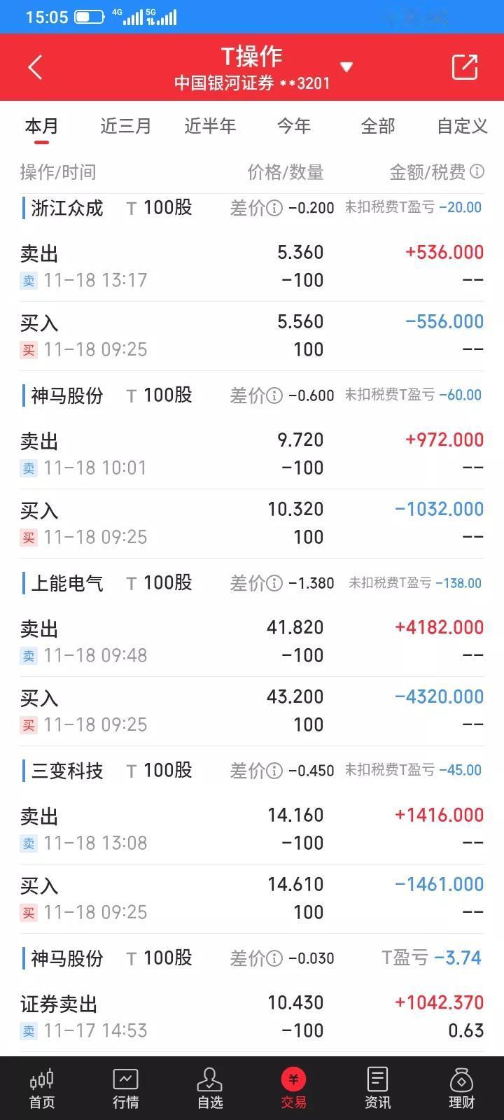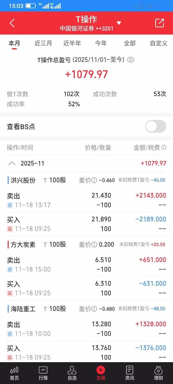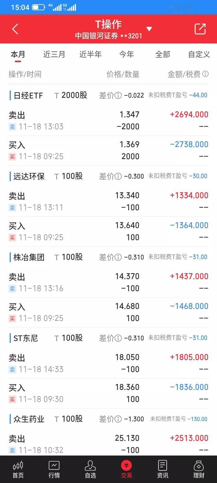 2025.11.18,今天做t,t了3只etf,全部亏损,亏了一百多块钱,t了18只股票,16只亏损,亏了800多块钱,2只成功,赚38元,总体盈亏相抵,今天做t全面失败,亏了979元。