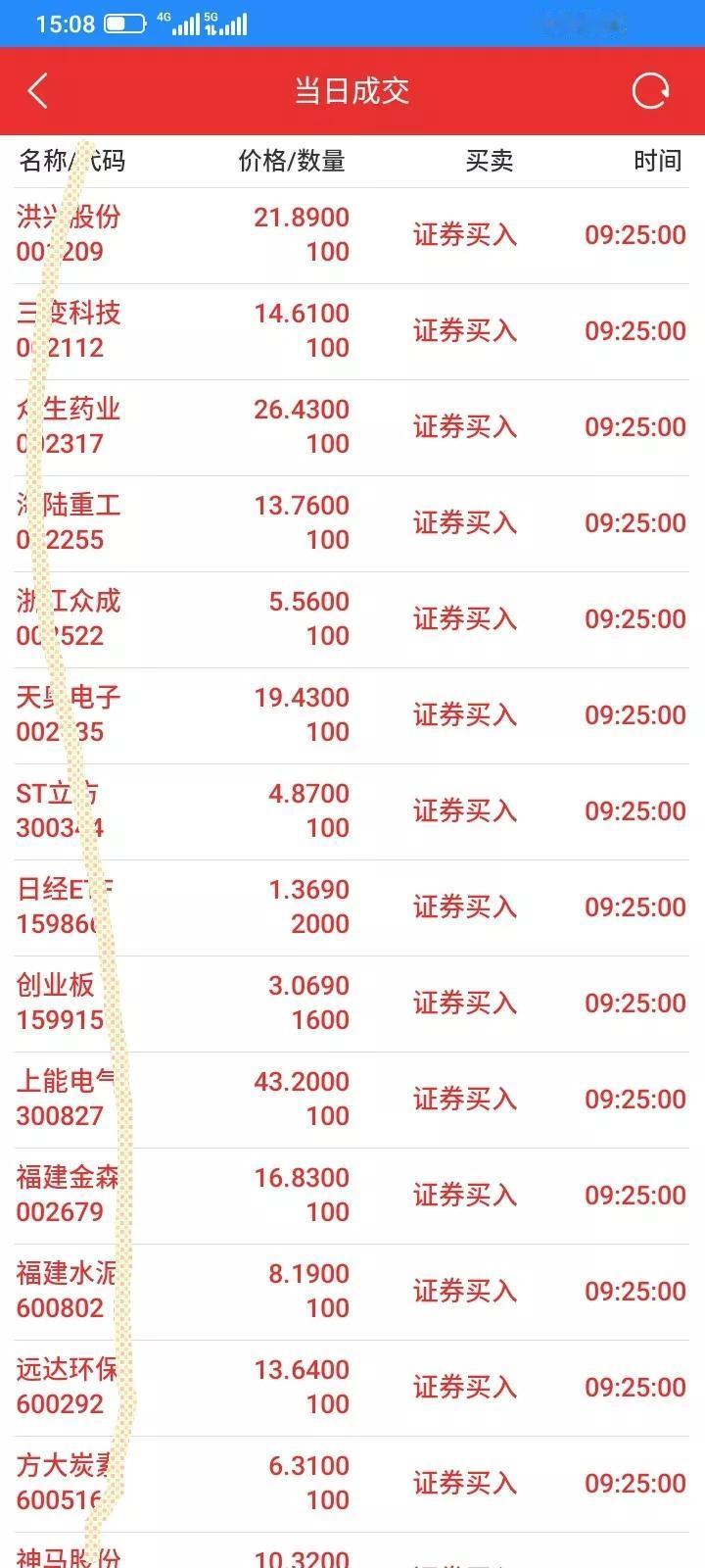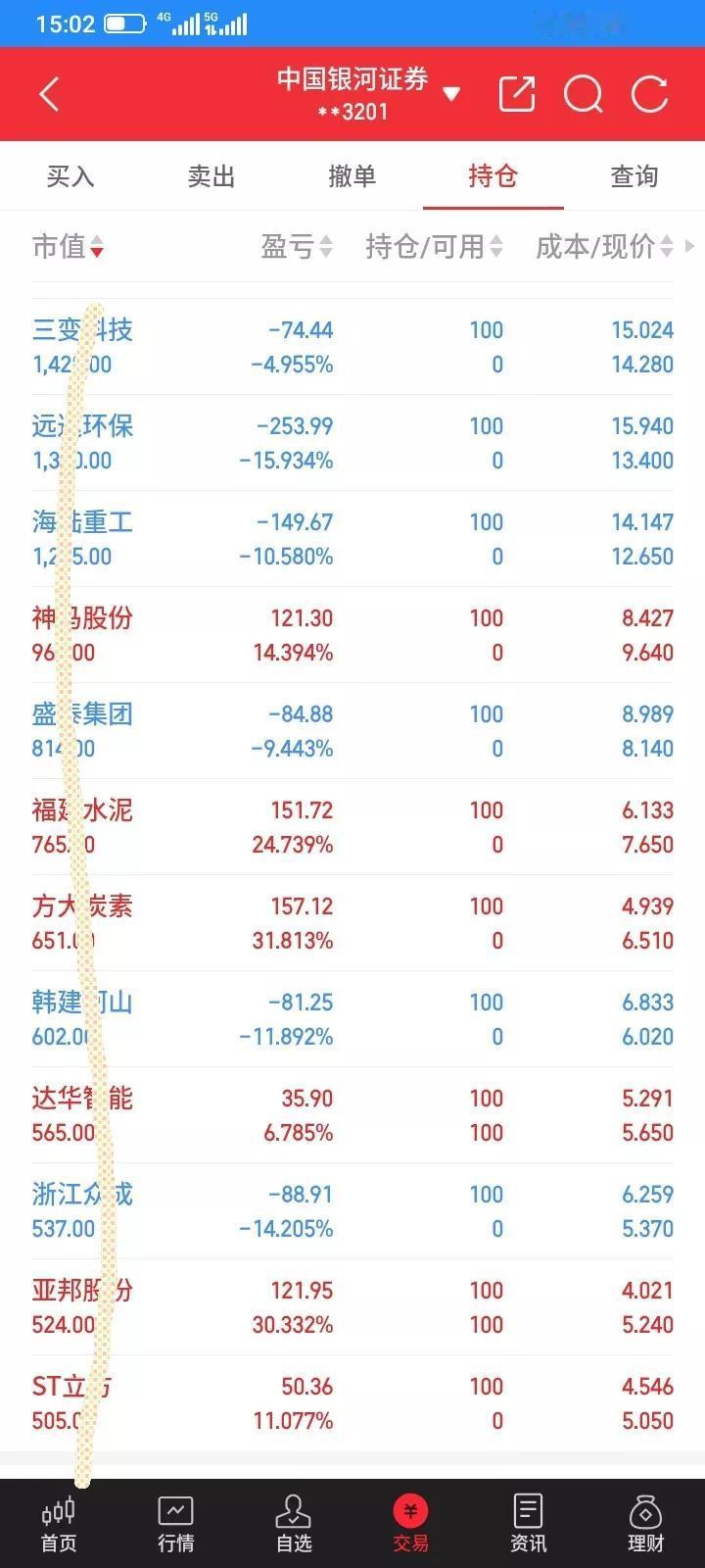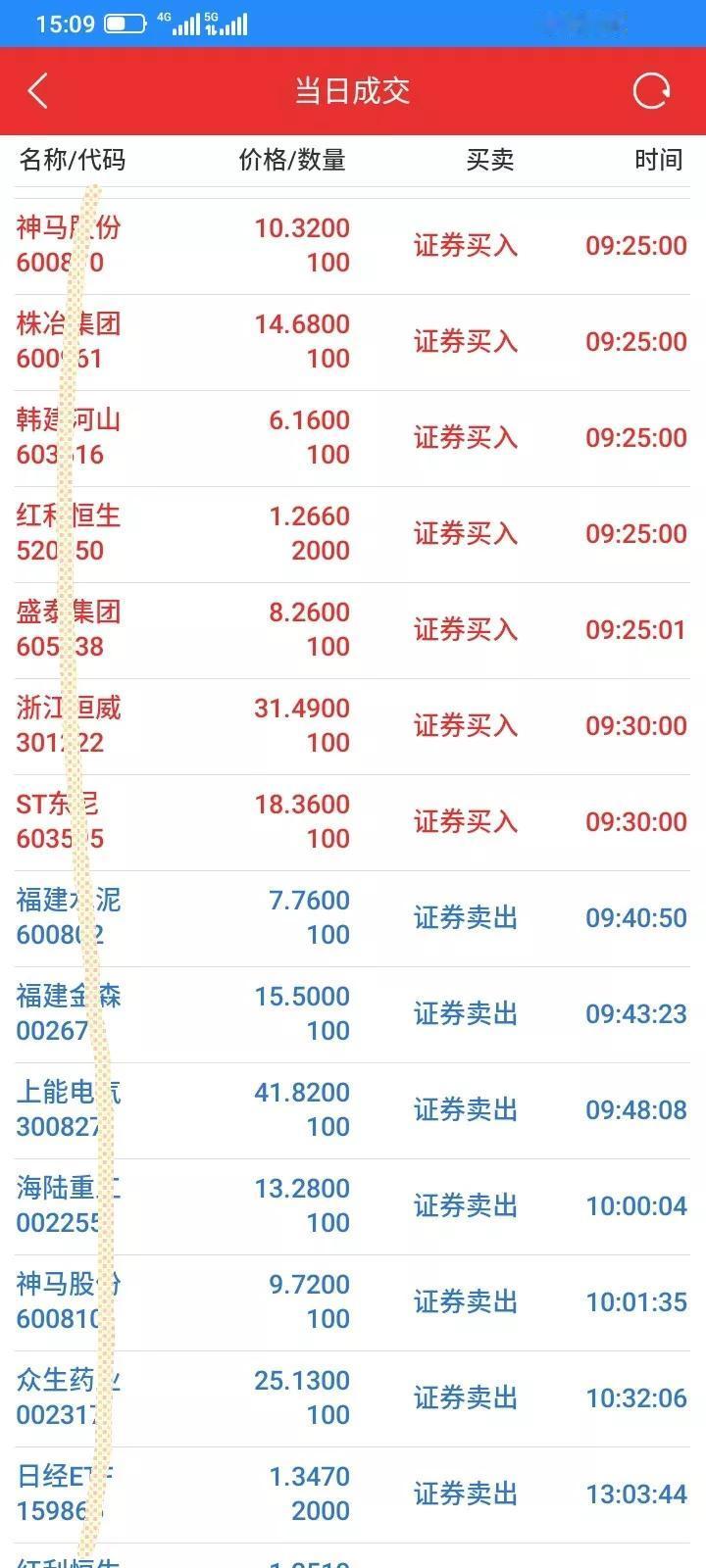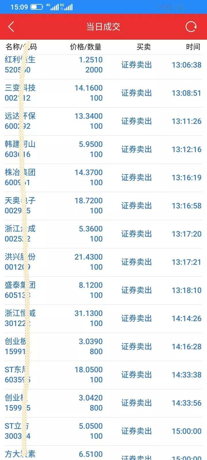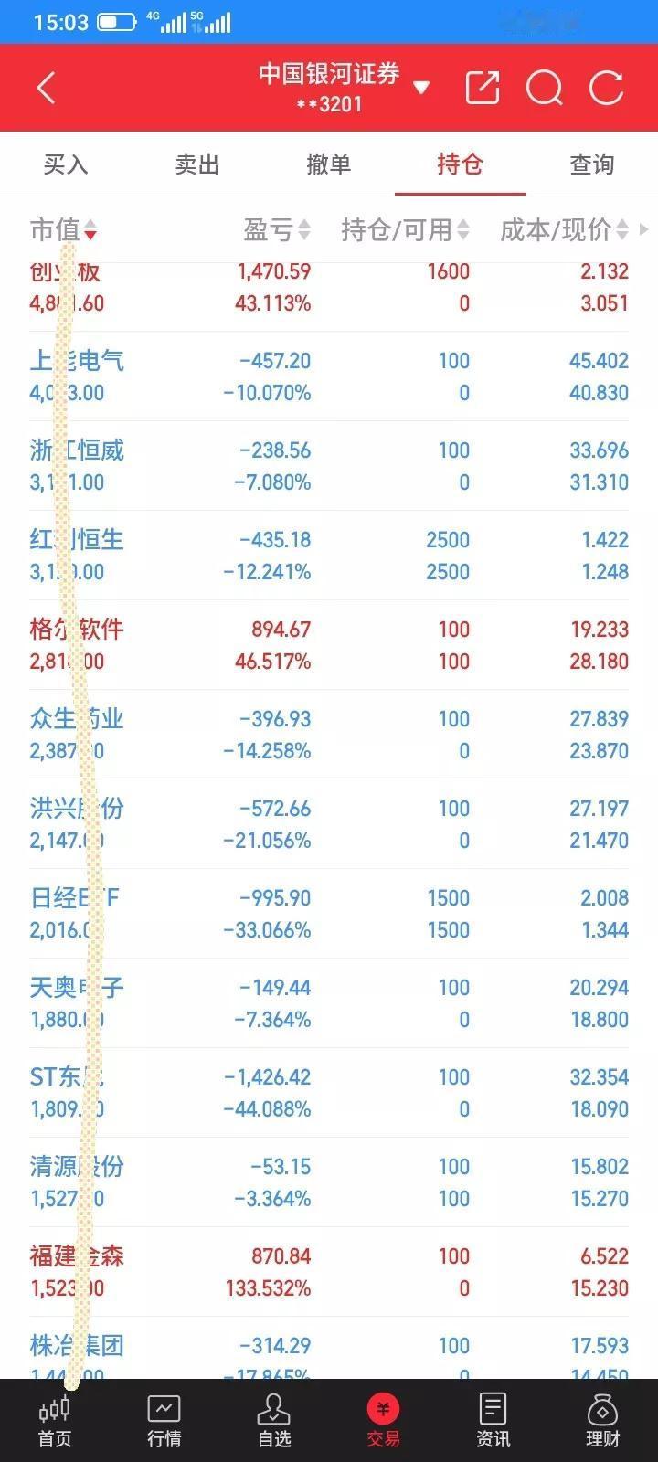 2025.11.18,今天是个悲催的日子,上证指数小幅下跌,但是我持有的都大跌,今天全面做t,全面失败。方大了一倍亏损。现在一共持有3只etf,22只股票。今天4只股票跌停,仓位最重的一只1只下跌了8个多点,其它的都下跌三四个点,1只涨停,2只反弹上涨了一点点。 早上9点多,委托买入了25笔。2000股日经,1600股创业板,红利2000股,其它21只股票都是买入100股,集合竞价结束,9.25成交了19笔,然后没有成交的就撤单,9.30又成交了2笔,有3只高开的没有成交。一共买入成功了21笔交易。 以21.89买入100股洪兴,以21.43卖掉,亏了46元。 以14.61买入100股三变,以14.16卖掉,亏了45元。 以26.43买入100股众生,以25.13卖掉,亏了130元。 以13.76买入100股海陆,以13.28卖掉,亏了48元。 以5.56买入100股众成,以5.36卖掉,亏了20元。 以4.87买入100股立方,以5.05卖掉,赚18元。 以1.369买入2000股日经,以1.347卖掉,亏了44元。 以3.069买入1600股创业板,以3.039卖掉800股,以3.042卖掉800股,亏了47元。 以43.20买入100股上能,以41.82卖掉,亏了138元。 以16.83买入100股金森,以15.50卖掉,亏了133元。 以8.19买入100股水泥,以7.76卖掉,亏了43元。 以13.64买入100股环保,以13.34卖掉,亏了30元。 以10.32买入100股神马,以9.72卖掉,亏了60元。 以14.68买入100股株冶,以14.37卖掉,亏了31元。 以1.266买入2000股红利,以1.251卖掉,亏了30元。 以6.16买入100股韩建,以5.95卖掉,亏了21元 以5.31买入100股方大,以5.51卖掉,赚20元。 以8.26买入100股盛泰,以8.12卖掉,亏了14元。 以31.49买入100股恒威,以31.13卖掉,亏了36元。 以18.36买入100股东尼,以18.05卖掉,亏了31元。 今天还好格尔继续涨停,不然还要多亏几百块钱。 今天一共t了3只etf,t了18只股票,只有2只股票反弹上涨,赚38元,其它的全部做t失败,亏了1017元元,盈亏相抵,一共亏了979元。 今天总资产,10.58万元,总市值降低到4.27万元,持股亏了1400多,加上做t亏了979元,今天总体账户一共亏了2415元。一天把一个月赚的全部亏完还倒亏了几百块。赚的都是浮盈,亏的才是实实在在的钱。