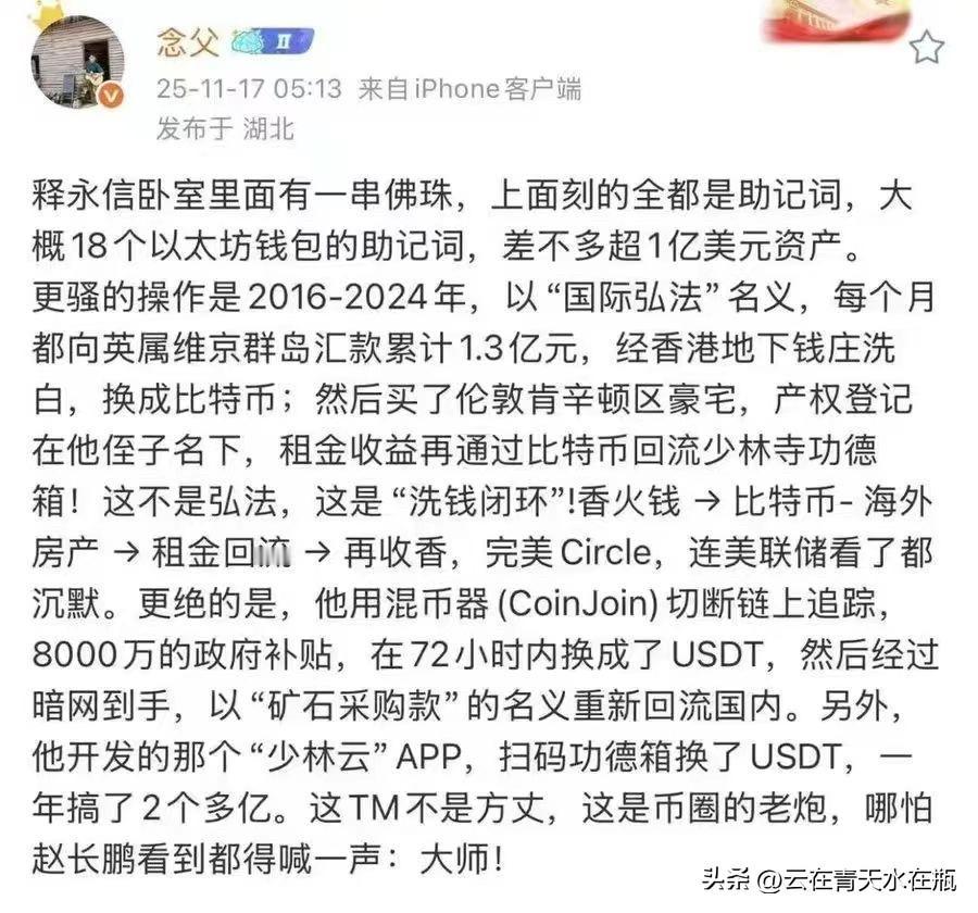 释永信洗钱套路真牛逼,美联储看了都要惊呼,喊释永信为大师! 助记词刻在佛珠上