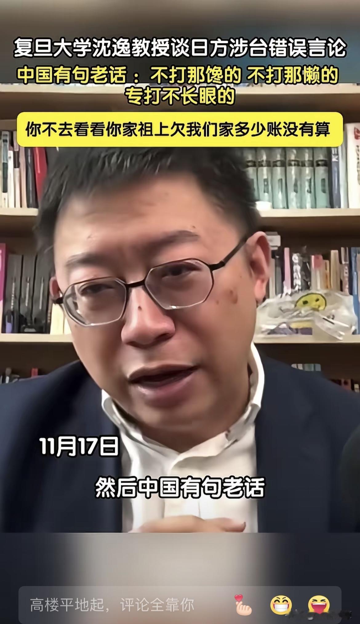 太解气!沈逸教授怒怼高市早苗:祖上欠账80年未还,还敢跳出来找事?沈逸教授这波怒怼太戳心! 一句“我忍你很久了”直接撕开高市早苗的虚伪面具,质问她“祖上欠的账没算,还敢不长眼挑事”,字字诛心。 今年正是日本侵华历史欠账80周年的关键节点,高市早苗不好好反思历史,反倒鼓吹“台湾有事就是日本有事”,为军国主义招魂。她忘了先辈犯下的滔天罪行,如今还想干涉中国内政,简直是自寻死路。 老话说“专打不长眼的”,高市早苗就是典型。历史账没结清,又想添新债,真以为现在的中国还会惯着?沈逸教授的怒斥,说出了亿万国人的心声:历史不容篡改,主权不容挑衅,再敢蹦跶,迟早要为自己的狂妄买单。 你觉得这波怒怼能让日本右翼收敛吗?来评论区聊聊~