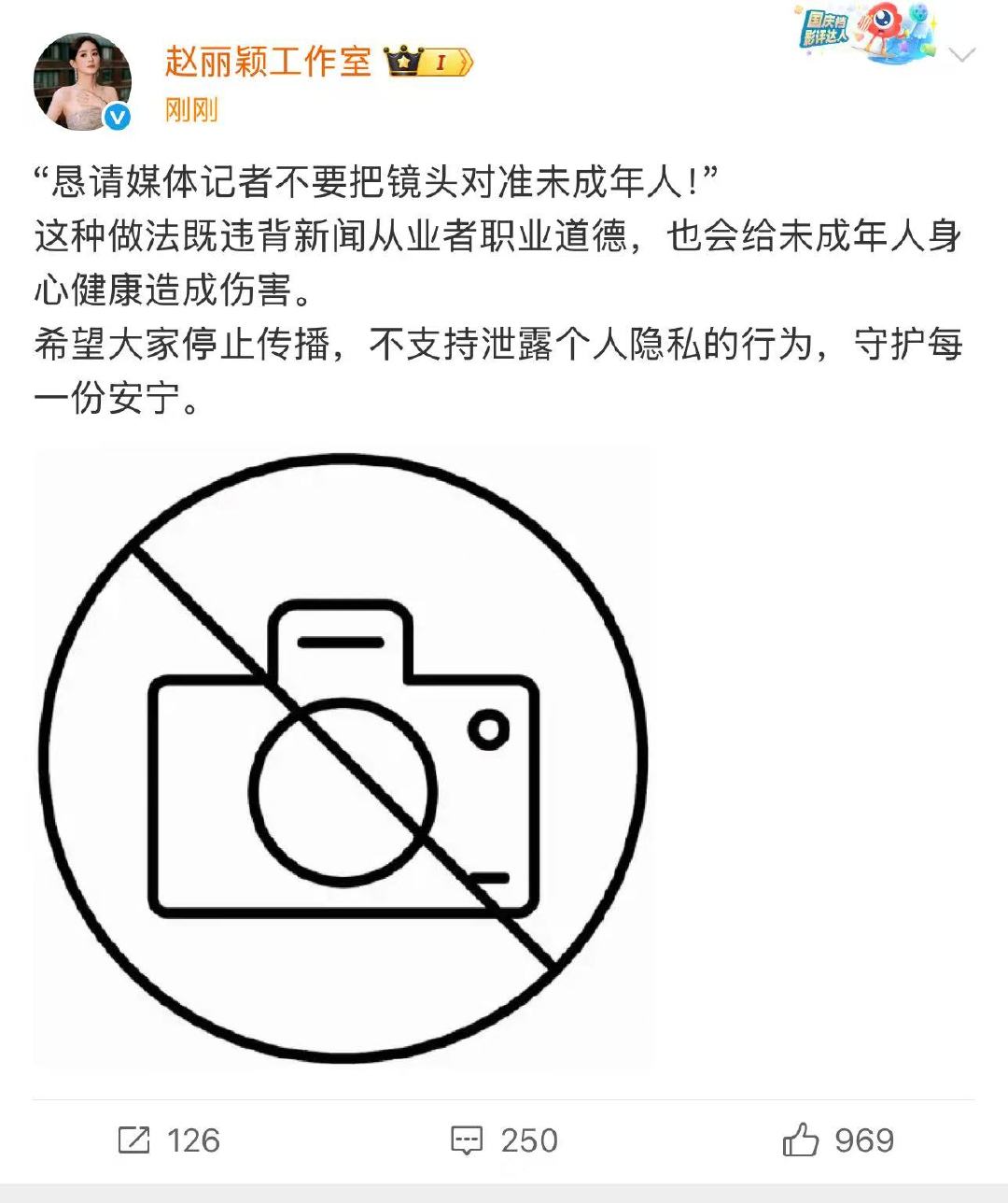 赵丽颖工作室说请不要把镜头对准未成年人