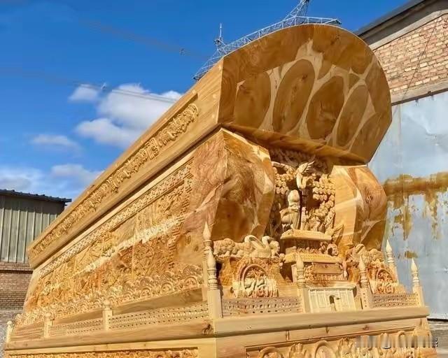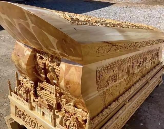 这口大棺材看起来是非常气派的,通体都是雕刻而成,木料看起来应该是非常名贵的木料,造价一定是非常高的,能够用得起这么贵重棺木的人家,应该是非富即贵,普通老百姓是用不起的!