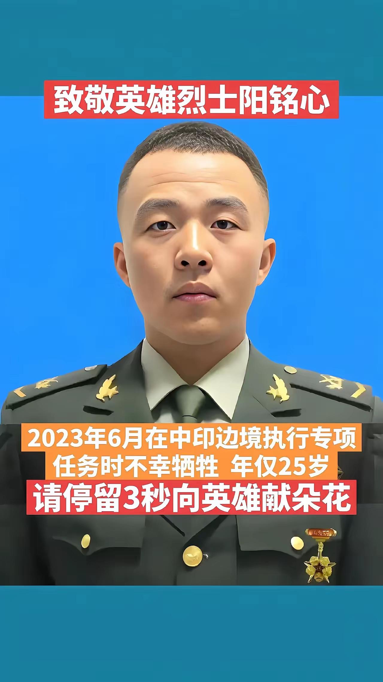 2023年6月,年仅25岁的阳铭心烈士。在西藏执行任务时,不幸壮烈牺牲,祖国无战事,军人有牺牲。泪别,英雄,一路走好! 2023年6月,西藏阿里,海拔5600米,零下20℃。阳铭心背着30公斤装备,带队巡逻,脚下是常年不化的冰河。突然,一块暗冰塌陷,他整个人坠入冰缝,头部撞击岩壁,鲜血瞬间染红冰面。战友拉绳救援,他却在昏迷前,用最后的力气把定位器塞进战友怀里,吼了句:“别管我,先保通信!”随后,冰缝二次坍塌,壮烈牺牲,年仅25岁。 遗体运回,军车经过狮泉河,沿途牧民自发点燃酥油灯,300多盏,照亮雪山。战友们整理遗物,发现他的日记本最后一页写着:“如果回不去了,请把骨灰撒在边防线,我要替祖国站一辈子岗。”母亲扑在棺椁上,哭到昏厥:“儿啊,你答应回来娶媳妇的!” 追悼会上,19岁的弟弟阳铭志敬礼接枪:“哥,剩下的路由我巡!”现场哭声一片。 阳铭心被追记一等功,骨灰一半葬在阿里烈士陵园,一半撒在他牺牲的冰河。如今,那条河被战友命名为“阳河”,河界碑上刻着一句话:“祖国无战事,军人有牺牲;你站立的地方,叫中国。” 留言告诉我,25岁的你,在为谁拼命?阿里烈士 阳铭心烈士