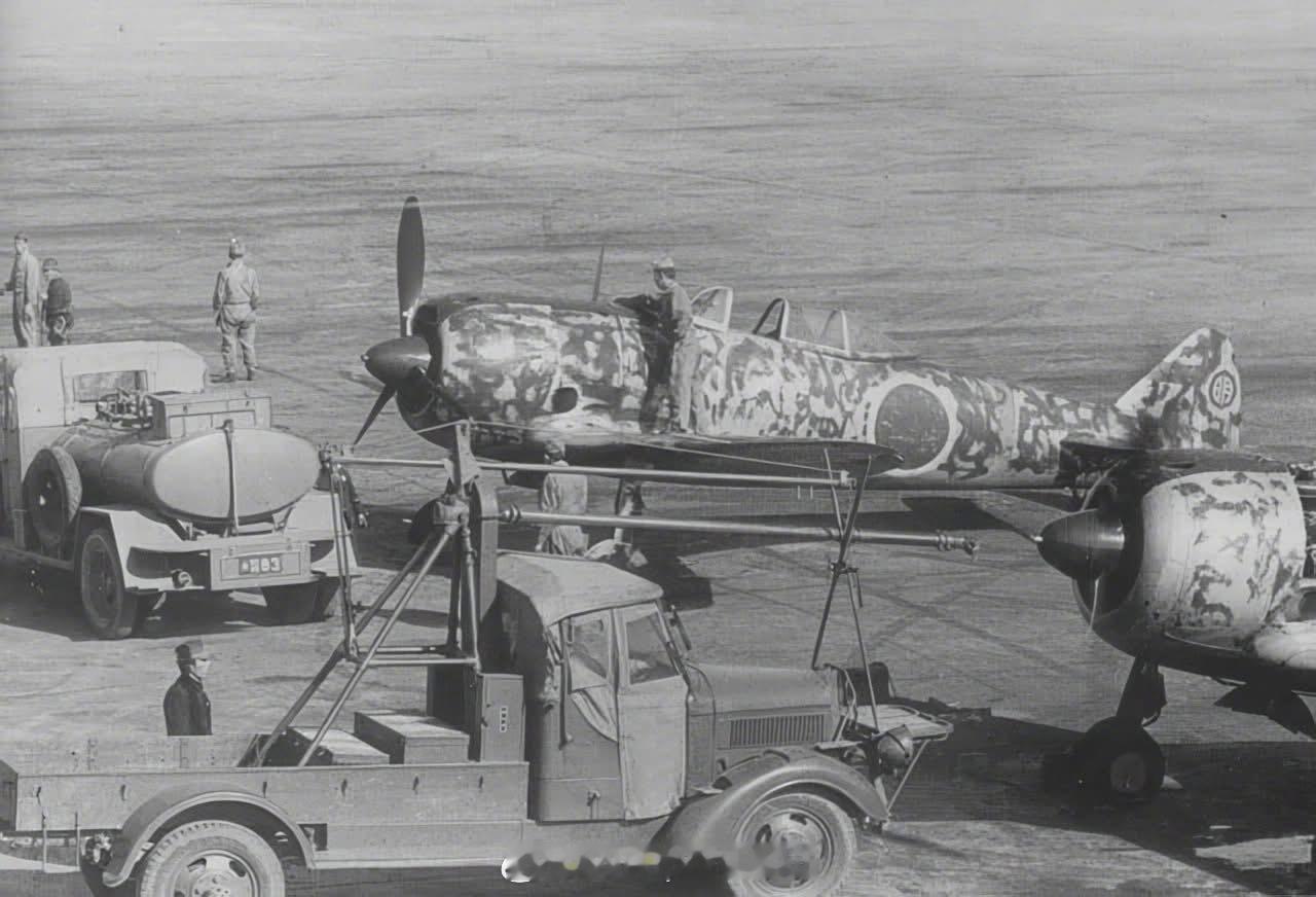 两架日军Ki-44战斗机正进行起飞前的准备工作,旁边停放有一辆加油卡车和一辆起动