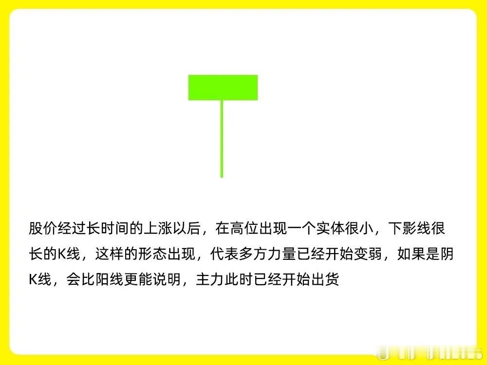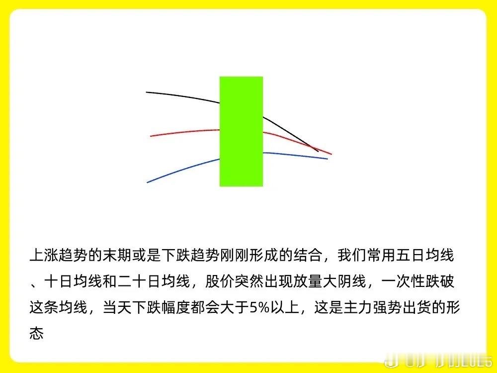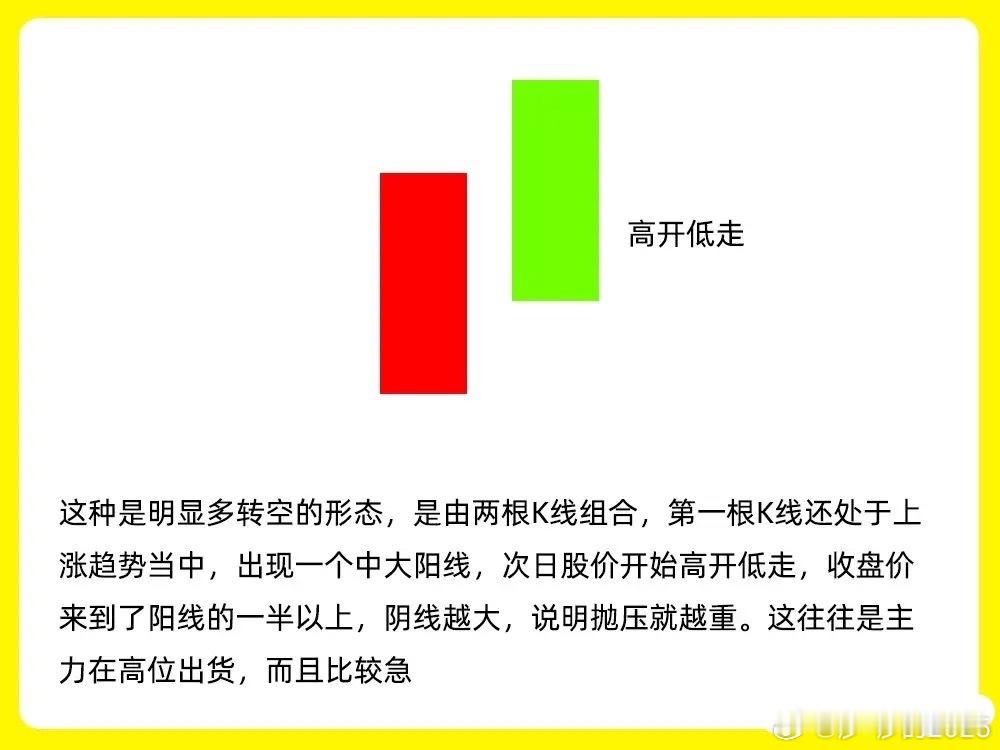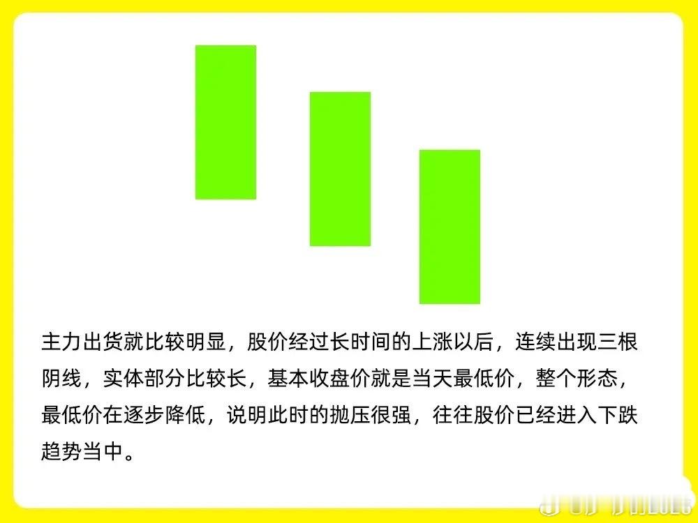 兄弟朋友们一定要明白!做交易归根结底就是低买高卖!其实 90% 的散户都在做反,老股民都认为,会买的是徒弟,会卖的才是师傅。股价高位,往往都是应该主力的出逃,导致的下跌,就会出现这种成交量异常,多方力量的减弱。我们来一起看看都有哪些形态和特征。一、吊颈线股价经过长时间的上涨以后,在高位出现一个实体很小,下影线很长的K线,这样的形态出现,代表多方力量已经开始变弱,如果是阴K线,会比阳线更能说明,主力此时已经开始出货二、断头铡刀上涨趋势的末期或是下跌趋势刚刚形成的结合,我们常用五日均线、十日均线和二十日均线,股价突然出现放量大阴线,一次性跌破这条均线,当天下跌幅度都会大于5%以上,这是主力强势出货的形态三、乌云盖顶这种是明显多转空的形态,是由两根K线组合,第一根K线还处于上涨趋势当中,出现一个中大阳线,次日股价开始高开低走,收盘价来到了阳线的一半以上,阴线越大,说明抛压就越重。这往往是主力在高位出货,而且比较急四、两阳夹一阴顾名思义是由三根K线组合,这种形态一般是股价高位,或是下跌趋势里比较常见。第一根是中阴线以上,次日出现反弹向上,但是力度并不强,成交量并没有出现放量,随后第三天股价继续下跌,就形成两边是阴线,中间夹着一个小阳线的走势。遇到这种反弹小阳线,还没有量的支撑,一定要管住手五、双飞乌鸦由三根K线组合,第一个K线是中大阳线,次日股价开始高开低走,形成阴线,第三天再次高开低走,第三天的阴线在形态上,会包裹第二根阴线的实体,这样的形态出现说明市场的多空分歧比较大。六、三只乌鸦这种形态,主力出货就比较明显,股价经过长时间的上涨以后,连续出现三根阴线,实体部分比较长,基本收盘价就是当天最低价,整个形态,最低价在逐步降低,说明此时的抛压很强,往往股价已经进入下跌趋势当中。以上就是六种K线形态上的主力出货。当然还有其他的,比如我们常说的头肩顶、M形顶、圆弧顶等等。下方我们配了六种形态案例图,记得文章和案例图一起看,如果这期内容对你有帮助或者启发,请给莎莎点赞,评论888