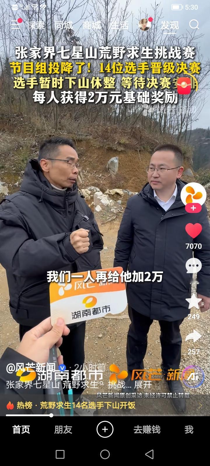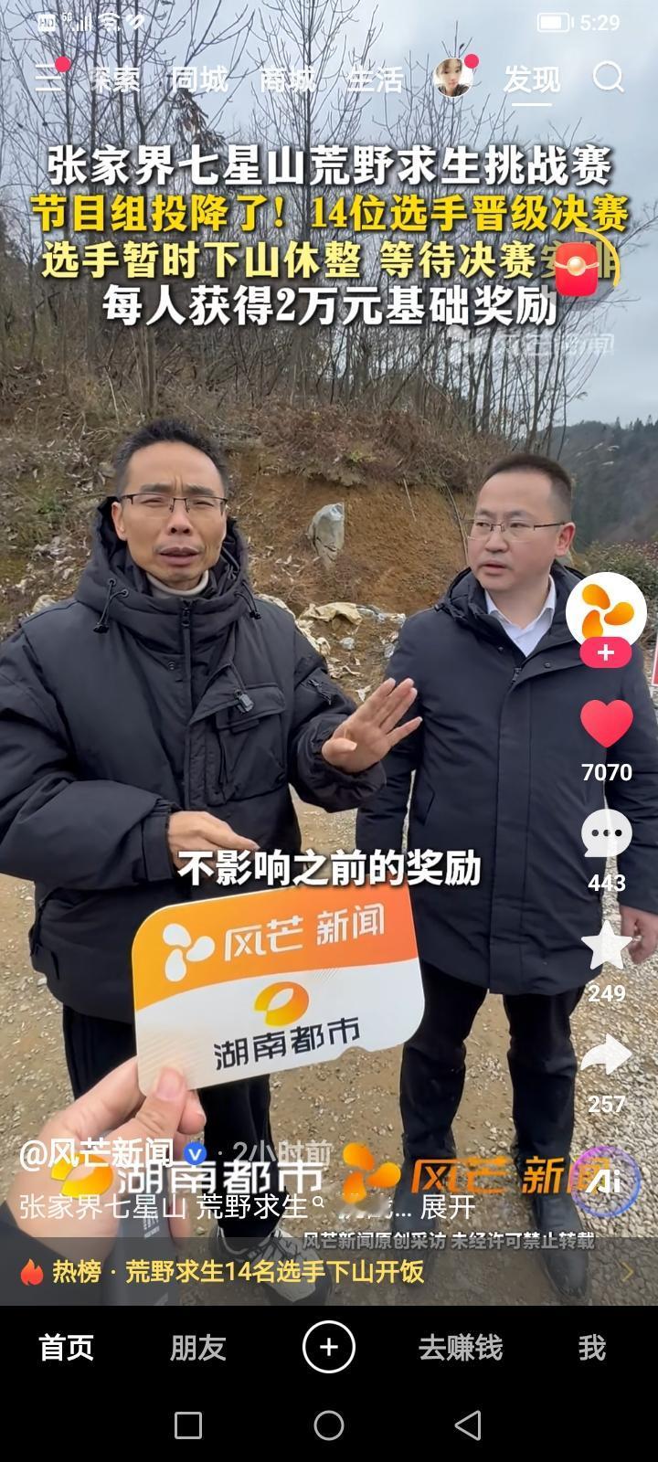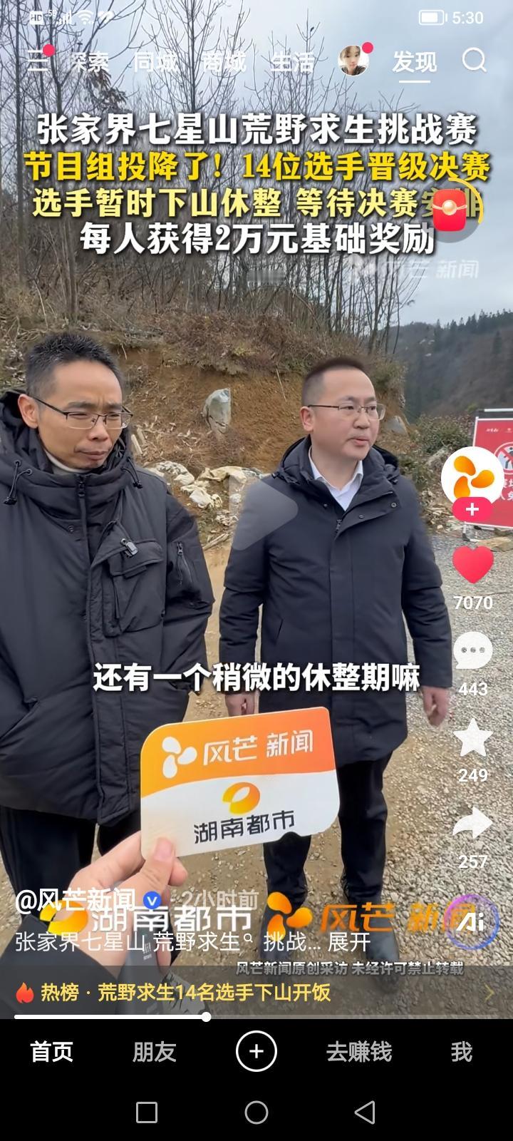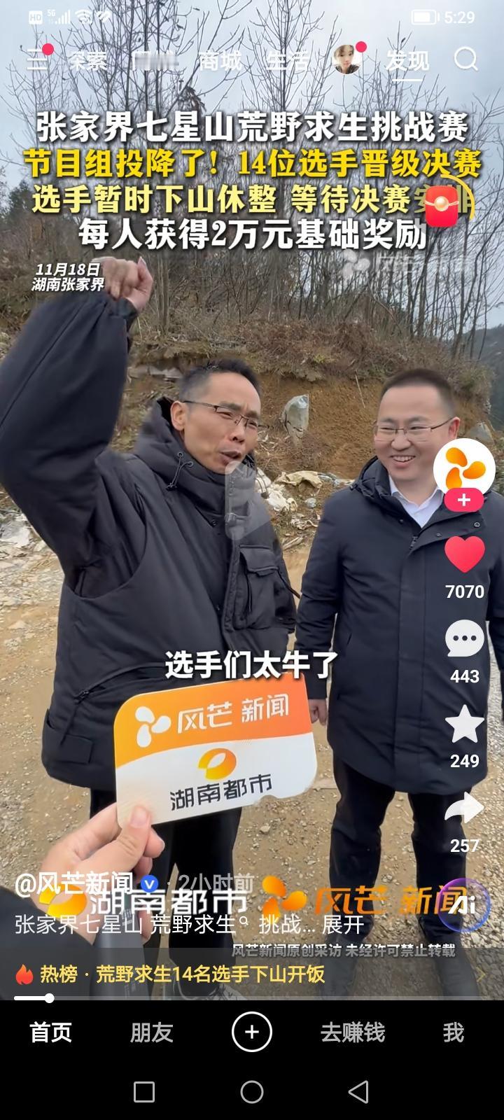 刚看到最新风芒新闻,七星山荒野求生比赛。主办方决定14名选手全部进入决赛,和之前的约定不变,每名选手加2万奖励,会有几天的修整期,不得不说,节目组的格局很大。我下午还发了一篇微头条,担心这几天天气变化太快,选手身体会受不了,主办方还是非常体谅选手的。这几天的休整期,选手可以调养身体,总结经验,快速学习之前不足之处。之前主办方说过决赛会发各类种子,会增加工具,我想应该也会让选手多一些抗寒衣物,估计主办方还会有其它变化,后续可看性应该会增加不少,想要决出冠军恐怕还要不少时间。七星山生存挑战 户外生存节目 七星山生存战 荒野七星山 野外求生档 野外求生赛 你会去参加类似荒野求生的活动吗
