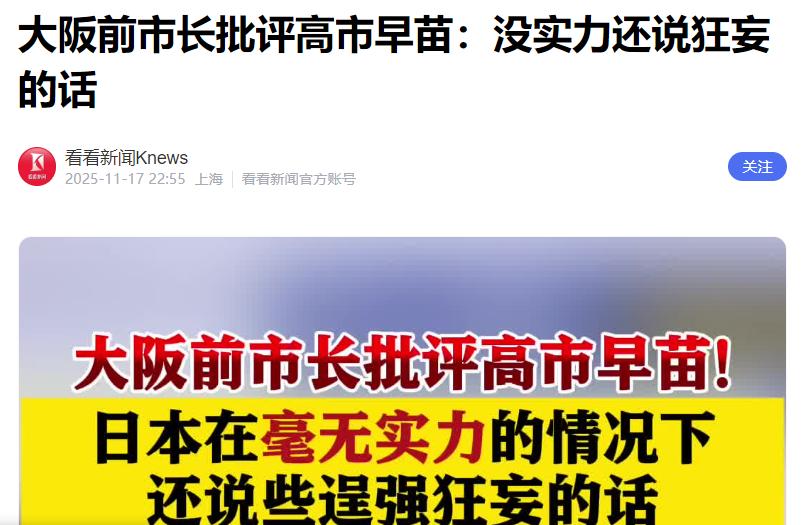 “没实力就应该闭嘴”!高市早苗遭到日本大阪市前市长怒斥。 作为现任首相,高市早苗11月7日在国会公然宣称“台湾有事”可能构成日本可行使集体自卫权的“存亡危机事态”,暗示要武力介入台海问题,这番话看似强硬,实则完全没掂量清楚日本的家底有多薄。 日本2024年版《通商白皮书》早写得明明白白,1406个品类的商品超一半进口额来自中国,是美国的2.5倍,光家电这一项,从中国进口的金额就占了进口总额的九成以上,连化肥生产必需的磷都主要靠中国供应。 更别提现在日本经济正处在低谷,今年第三季度实际GDP按年率算下降1.8%,六个季度来首次萎缩,本身就经不起折腾。 高市早苗的言论一出来,中方接连发布赴日旅游、留学预警,野村综合研究所直接算出损失——这可能让日本少赚2.2万亿日元,GDP还要再降0.36%,要知道日本2025财年的潜在经济增长率也就0.6%,这一下就砍掉了一半多。 日本的股市更是立马翻脸,资生堂、三越伊势丹跌了近10%,日本航空盘中跌幅超5.8%,那些靠中国游客吃饭的行业直接慌了神,毕竟2024年赴日国际游客里近五分之一是中国人,消费额还排第一。 再说外交和实际影响力,高市早苗嘴硬着不撤回言论,日本外务省却赶紧派亚洲大洋洲局局长金井正彰急着访华解释,这波操作被桥下彻直接点破“在那个瞬间就已经完全输了”。 说到底,中日力量对比摆在那,中方外交部副部长孙卫东早就严正表态,若日方胆敢武力介入,必将迎头痛击,14亿中国人民绝不答应,这种强硬可不是口头说说。 而高市早苗自己都圆不上话,被问起“为何日本存亡会受威胁”,只含糊说“综合判断”,连具体理由都给不出,比起历届政府在台湾问题上的谨慎,她这纯属硬撑场面。 更讽刺的是,连日本自己人都看不下去。前首相鸠山由纪夫直接发文骂她是在煽动危机、为扩军找借口,前首相石破茂也说历届政府从没敢这么明确表态,甚至超百名日本民众跑到首相官邸前抗议,喊着“不需要煽动战争的首相”。 日本现在供应链对中国的依赖度远超美欧,G7国家里日本近40%商品高度依赖单一进口来源,其中大多是中国,这比美国的20%、德国的10%高出一大截,这种情况下喊着要对抗,不就是拿自家经济命脉开玩笑。 高市早苗大概是忘了,日本连自身供应链都没理顺,汽车产业还在受美国关税拖累,七大车企上半年利润全下滑,这种时候不想着稳经济,反而靠激进言论讨好国内强硬派,难怪桥下彻要怒斥她“没有那么大的实力,却偏要口出逞强之言”。 那些嘴上喊着强硬的政客,根本没算过账,一旦中日关系真的恶化,先扛不住的是日本的民生和经济,这种明摆着的亏,也就高市早苗还在硬撑着不承认。