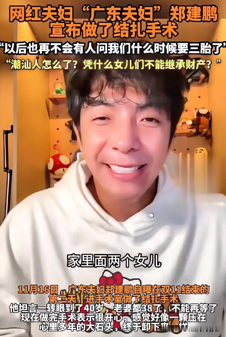 这个男人为啥敢明说自己已经做结扎了? 原因其实很简单, 这个40 岁男人是个网红,叫郑建鹏,他老婆生俩孩子受的罪他全记着,疼老婆,千万别只说不做。 与其让老婆受累,不如自己挨半小时的刀,男人疼老婆不是嘴上哄,得往自己身上扛。 以前总有人催三胎,甚至暗戳戳说“没儿子咋继承”,他直接做结扎断了这些话头。 还说女儿也是亲骨肉,凭啥不能继承财产,把传统里那点“重男轻女”的偏见,用行动给掰正了。 这是男人该有的担当,你说是不是?