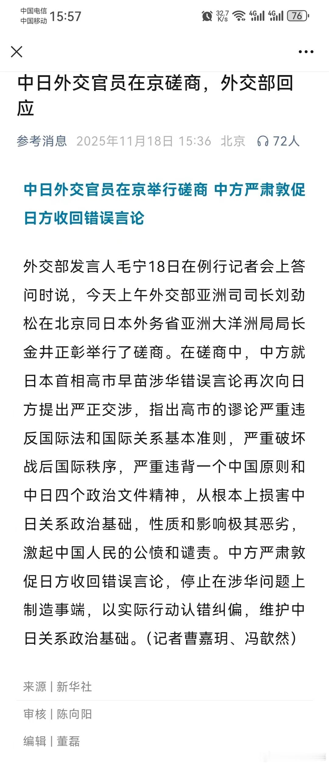 中日外交官员在京举行磋商,中方严肃敦促日方收回错误言论