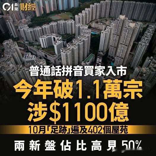 普通话拼音买家买房,连续8个月逾千宗! 香港整体楼市气氛持续回暖,吸引大批内地买家积极入市。中原地产数据显示,以普通话拼音登记的买家,已连续八个月录得逾千宗。 10月录得1,369宗成交(一、二手私人住宅),按月升7.3%,总入市金额达155.7亿元,比9月增加17%,创去年11月后11个月新高。 10月份全港402个屋苑均录得普通话拼音买家入市,其中两个单幢新盘,包括九龙城瑧博录59宗,西半山The MVP则有55宗,分别占楼盘整体成交约51.3%及49.1%。 来源香港“CI 新闻财经”(香港01)