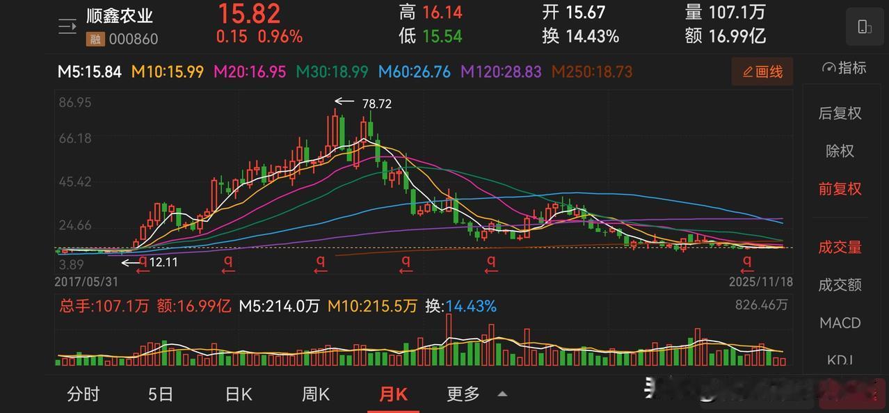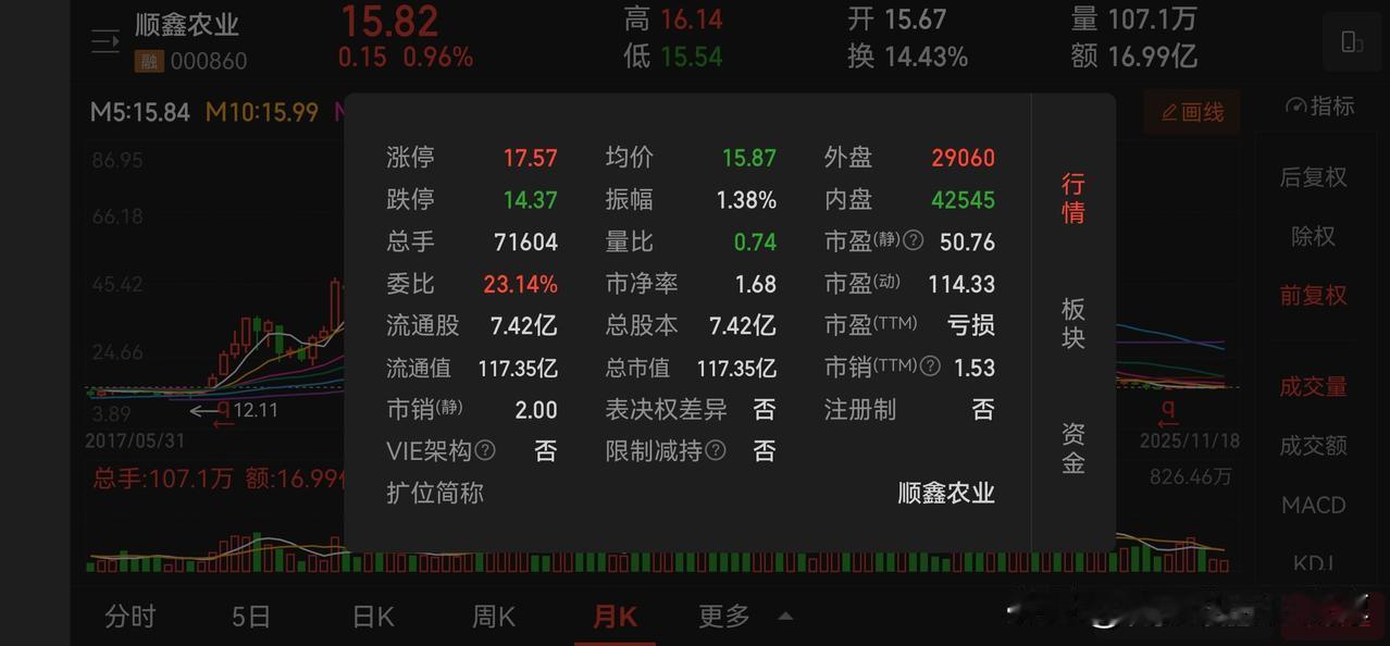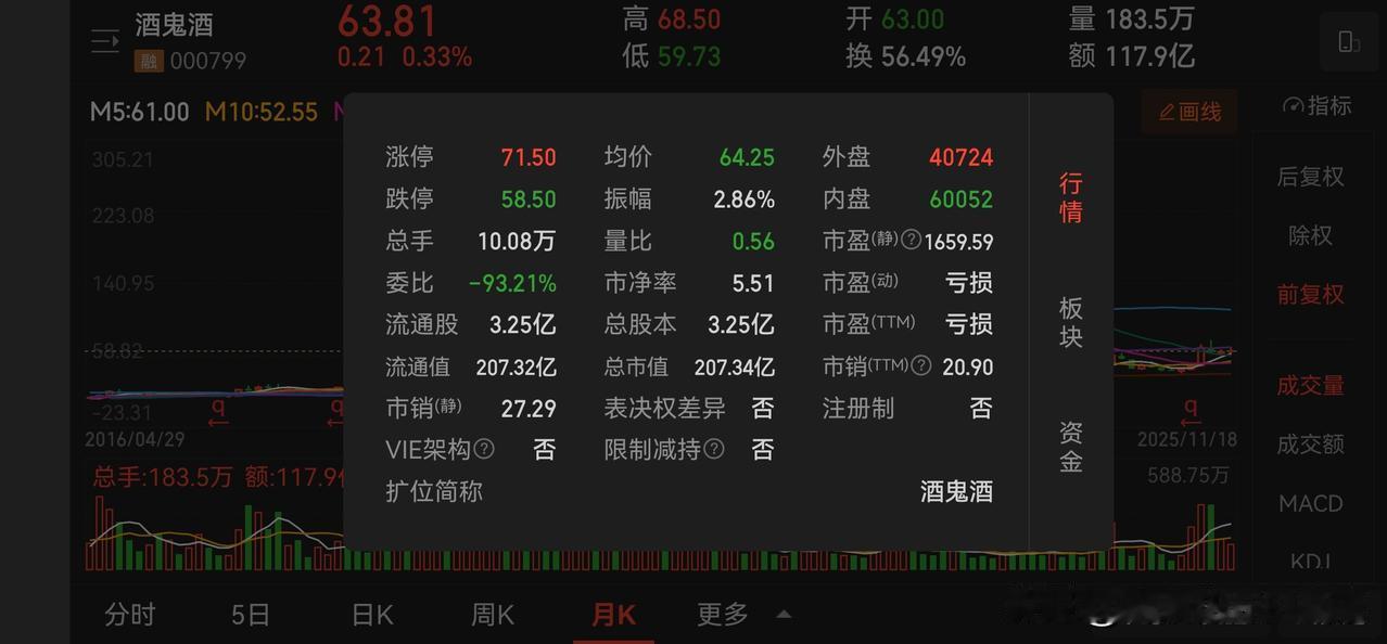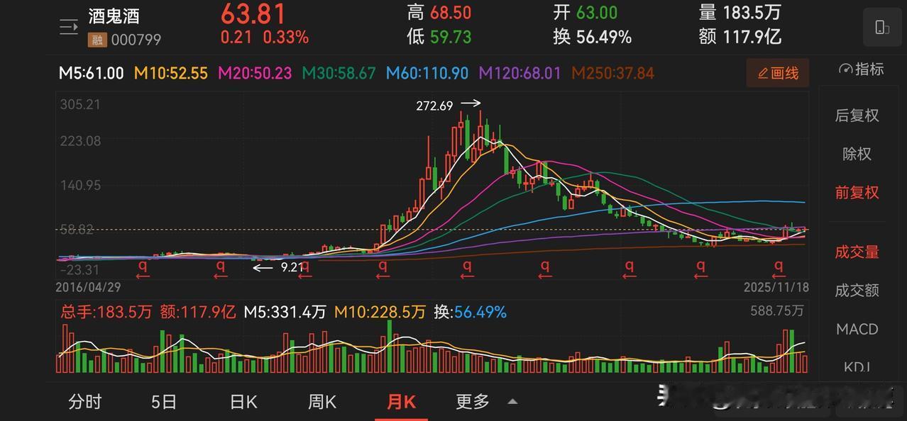 白酒板块现在是非常有意思的一个板块,板块整体保持了坚挺,有很多传统的白酒品种已经杀到了极低的位置,并且拒绝下跌。 从市盈率角度来看,贵州茅台还在20倍左右,五粮液、古井贡酒和山西汾酒、泸州老窖已经在16倍左右。 顺鑫农业亏损,但是市净率只有1.68,酒鬼酒也是亏损的,但是酒鬼酒跌下去已经在低位盘整了很久,并且现在看再往下跌也有难度,上涨也有难度。 所以现在看白酒股的话,可能就是还需要沉淀,大跌和大涨暂时来看都有点困难。从投资的角度看,是可以列入跟踪的。 个人的看法是,如果白酒真要涨的话,有可能会先从类似于酒鬼酒、古井贡酒这样的品种涨起。所以我们首要关注的是二三线白酒品牌股价的异动信号。 这个行情什么时候会来,我们并不知道,极有可能是大家都不看好的时候,悄悄的发生。