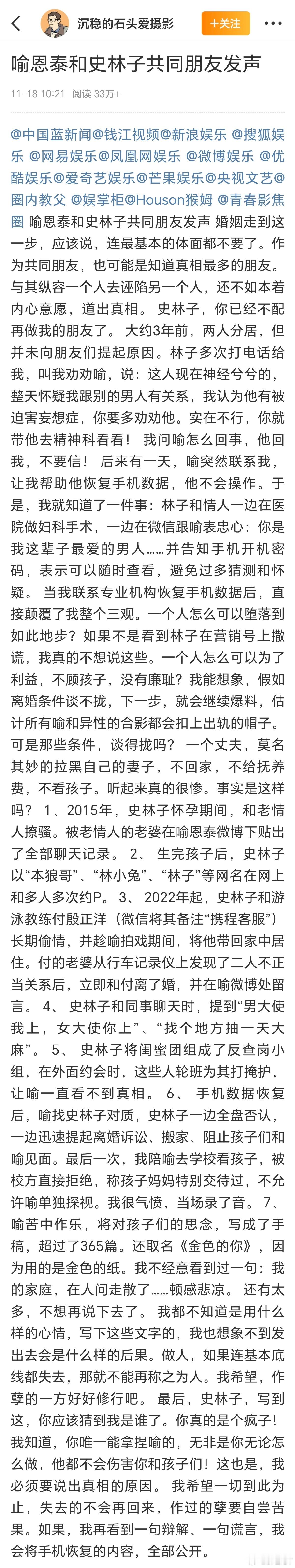 喻恩泰这瓜,反转的很迅速啊。昨天传的还是喻恩泰“处心积虑”的离婚,转移走300箱茅台。今天就是女方恶人先告状,不仅婚内出轨,与多人多次YP。在被喻恩泰质问后,还一边全盘否认,一边迅速提起离婚并搬家,拒绝孩子和喻恩泰见面。看得我大受震撼。喻恩泰手里头都有证据的,她怎么敢倒打一耙?