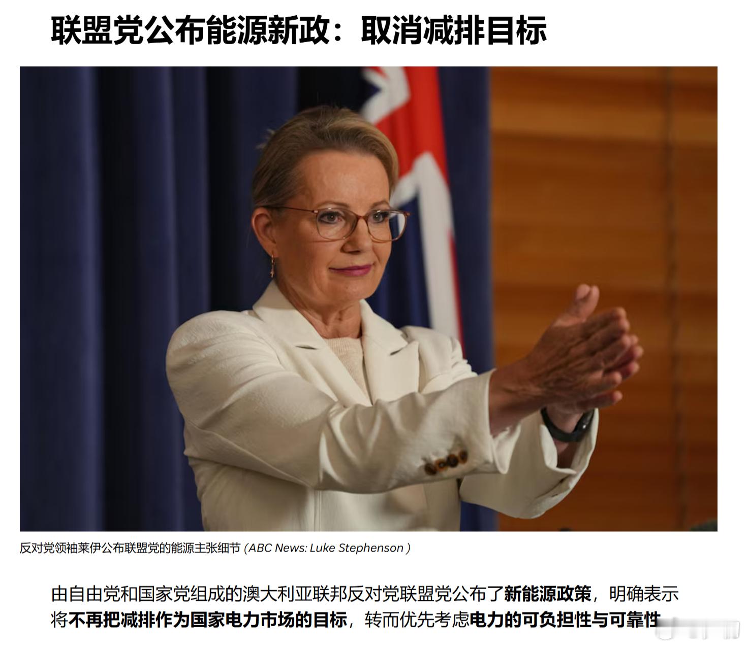 由自由党和国家党组成的澳大利亚联邦反对党联盟党公布了新能源政策,明确表示将不再把减排作为国家电力市场的目标,转而优先考虑电力的可负担性与可靠性。丁院士对西方在环保方面的预言含金量还在不断上升!