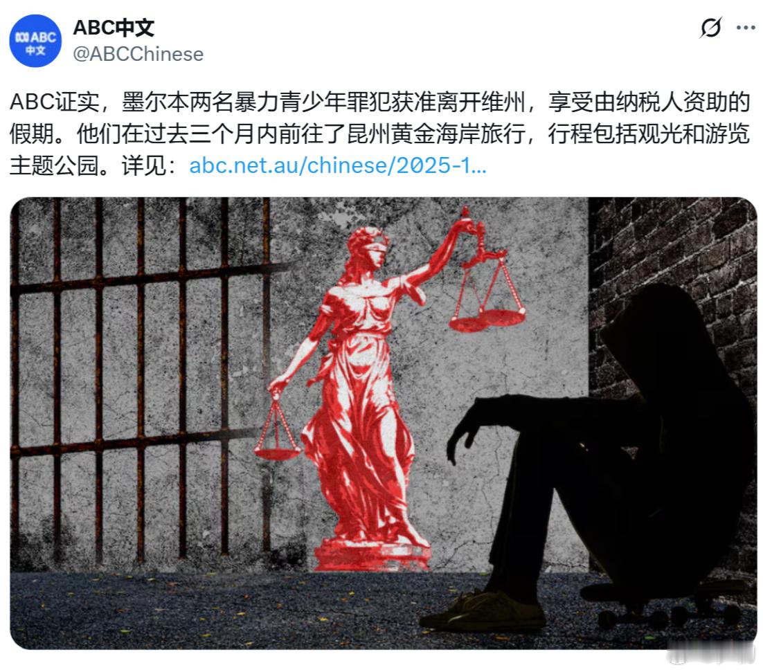 澳大利亚ABC新闻网:墨尔本两名暴力青少年罪犯获准离开维州,享受由纳税人资助的假期。他们在过去三个月内前往了昆州黄金海岸旅行,行程包括观光和游览主题公园。要不说澳大利亚是流放的罪犯建立的国家呢,对罪犯是真的好!