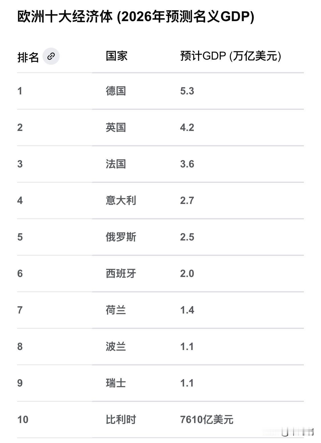 欧洲经济在2026年的预测 GDP总额为31.4万亿美元(约合27.0万亿欧元)。国际货币基金组织(IMF)的最新《世界经济展望》预测显示,德国将以5.3万亿美元的GDP领跑欧洲经济体。 区域经济概况 (2026年预测) 西欧 仍然是欧洲最大的经济集团,总计约12.8万亿美元,占欧洲总产出的近40%。 北欧 预计GDP总额为7.3万亿美元。 南欧 预计GDP总额为5.9万亿美元。 东欧 预计GDP总额为5.4万亿美元。