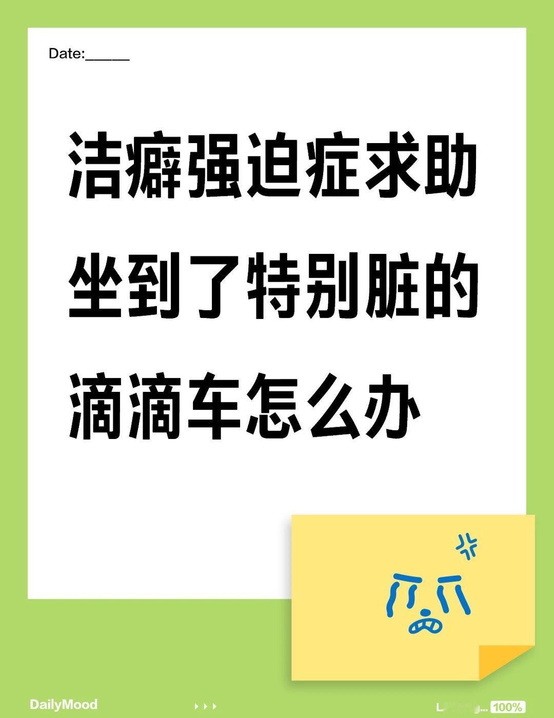 洁癖求助 打车坐到了特别脏的车怎么办 早上上班快迟到了,打了个滴滴,打开车门就看见车座垫上全是白色的饼干(面包)渣子,当时想着将就一下就坐了,坐上去越来越不舒服,真的全是饼干渣子! 更恐怖的是我突然看到一只小虫子在坐垫上面爬,顿时我心跳的特别快,感觉头发都竖起来了,实在忍不了了,我问司机我说你这车上一堆渣渣是什么,他说不好意思是家里小孩在后面吃的饼干没打扫,我说上面还有虫子在爬! 实在受不了了,我让他停车我下去了,下车之后立马就吐了,控制不住的呕吐,吐了三次差不多,冷静下来打车回家了。又没办法上班了只能跟领导请假,特别内疚,心里更难受了。 回家从头到脚洗了一遍,现在不知道我的裤子要怎么洗才能洗干净,外面的羽绒服也要洗。能不能告诉我如果遇到这种情况你们会怎么做,崩溃,想死。。 洁癖强迫症 洁癖 强迫症 ocd 洗衣服 脏 精神病