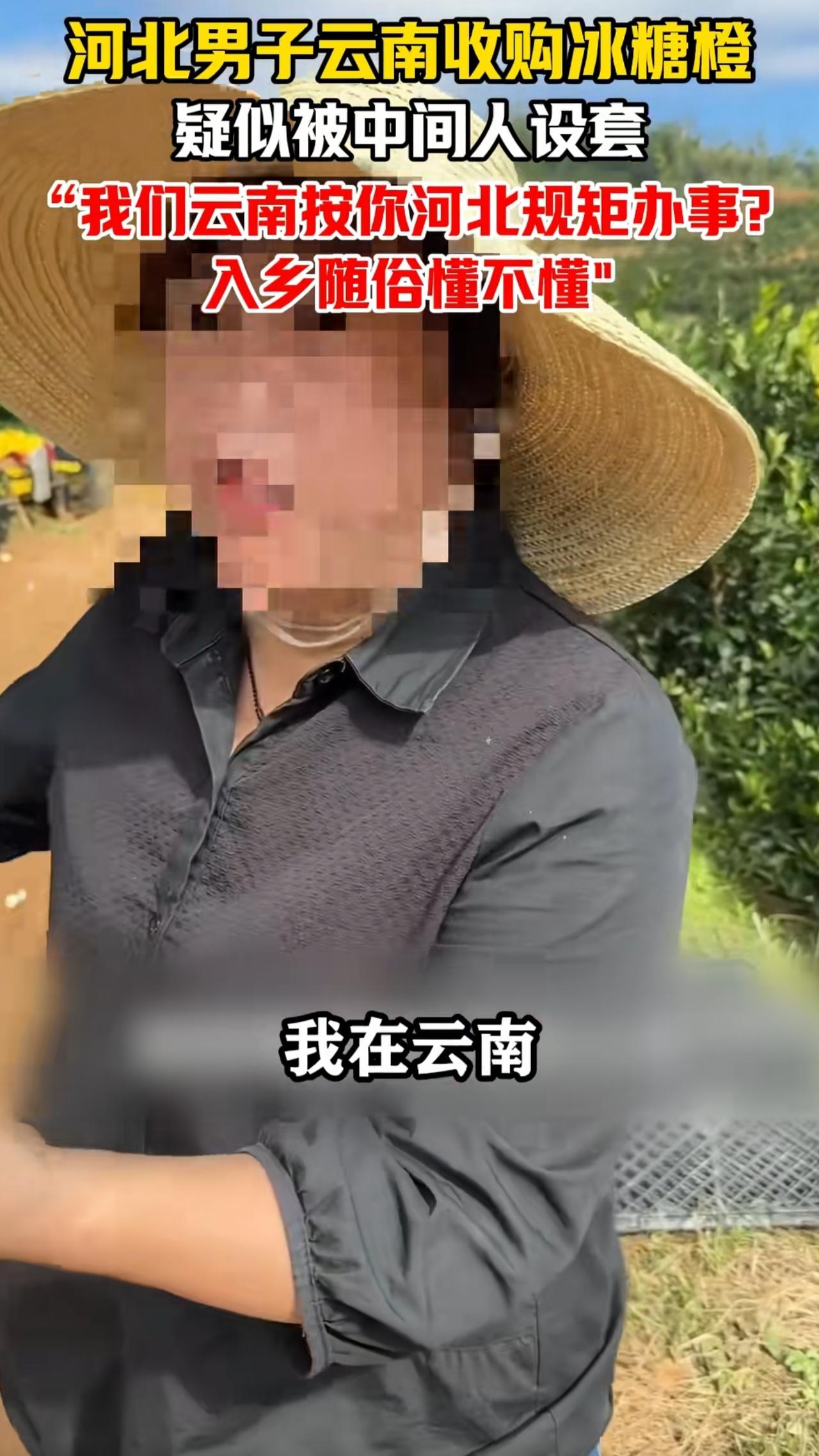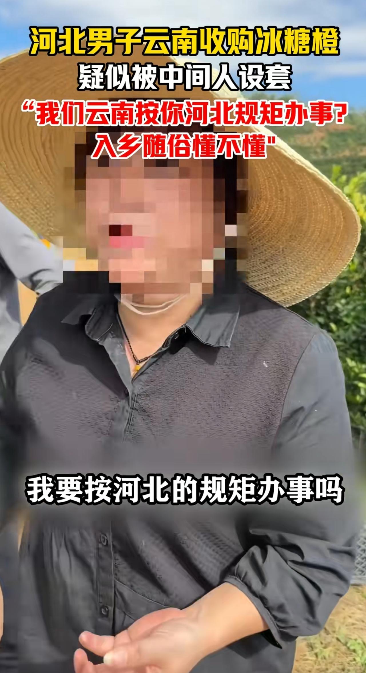 你一句“入乡随俗”,可是把云南冰糖橙给坑惨了! 近日,河北一位大哥通过代办介绍来到了云南采购冰糖橙,到了之后便感觉自己被骗了,一开始说好的全黄的冰糖橙现在变成了大部分是绿色的。据了解,绿色的冰糖橙虽然耐放,但是吃起来口感和味道不如全黄的,这样一来采购回去的话,势必会影响销量的。 河北这位大哥心里知道这是有人在背地里使坏,但是为了避免给果农造成大的损失,他仍然决定收下这批冰糖橙。但是他有一个小小的要求,就是退回多余的筐子,因为有一部分筐子没有使用,他就问代办大姐是否可以把这些筐子钱给他退回来,结果代办大姐一下子就急了,张口便说起来了大道理:“入乡随俗这句话懂不懂!来到云南怎么还能按你们河北的规矩办吗”!大姐说的振振有词,还举了个例子给河北这位采购商,似乎真理都掌握在她嘴里。 网友热议:“前有宁夏西瓜,后有云南冰糖橙”,大姐的一句“入乡随俗”可是把云南冰糖橙给坑惨了,可是把云南冰糖橙果农给坑惨了。 做买卖最忌讳的就是言而无信,代办这样做不仅坏了自己的名声,往大了说,她也坏了云南冰糖橙的名声。