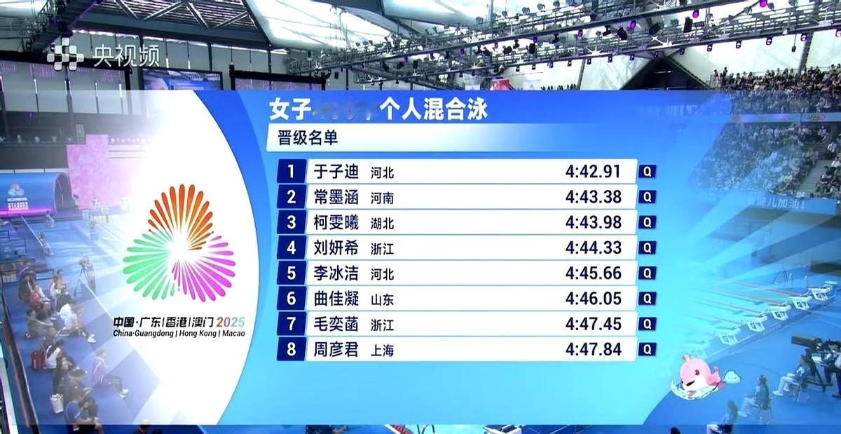 “自由泳女王”李冰洁今晚要游混合泳,预赛却只排第五,比她自己保持的全国纪录慢了17秒。 有人担心她“跨界翻车”,可别忘了,她去年奥运接力的金牌正是靠最后50米自由泳生吃回来的,而400混的最后一程正是自由泳。 15岁的于子迪先声夺人,4分42秒91把前辈们全压进水里。 教练私下说,她蛙泳腿还是“半吊子”,靠蝶仰自硬补,像极了考试偏科却总分第一的那种同学。 如果今晚她依旧用“长板拖短板”的打法,冠军真可能一夜成年。 常墨涵、柯雯曦、刘妍希三人成绩差不到一秒,相当于同一条泳道里同时碰壁。 全运会泳池的水线,今晚大概率要被拍翻几次。 纪录是4分28秒43,叶诗文12年前写下的名字。 八年过去,国内最接近的一次也差了9秒。 姑娘们不是不想破,而是破之前得先回答一个问题: “到底先拼前程,还是留气给后程?” 答案没标准,全看谁在转身那一刻敢把肺活量押上。 观众席的爸妈们攥着国旗,手比选手抖。 他们懂,孩子练混合泳等于交四份学费,蝶仰蛙自一个教练一个脾气,错一天节奏,晚上回去自己加练到关灯。 奖牌颜色决定的不只是荣耀,还有接下来四年训练经费的配额。 省队里一条不起眼的训练道,可能就因今晚这一枪被保留或撤掉。 所以小姑娘们在水里拼命,其实也在为身后一整条“生产线”抢口粮。 今晚8点,哨响那一下,别只盯着谁触壁最快。 看看转身之后,谁还敢继续加速——那才是真正的赛点。 如果李冰洁最后50米从第五蹿到第一,别惊讶,她不过又一次把自由泳的剧本挪到了混合泳; 要是于子迪守住优势,新的时代就正式官宣。 纪录和青春,总要有一个先被刷新。 泳池只有50米,人生却不止400混,敢在转身后仍加速的人,才算真正上岸。