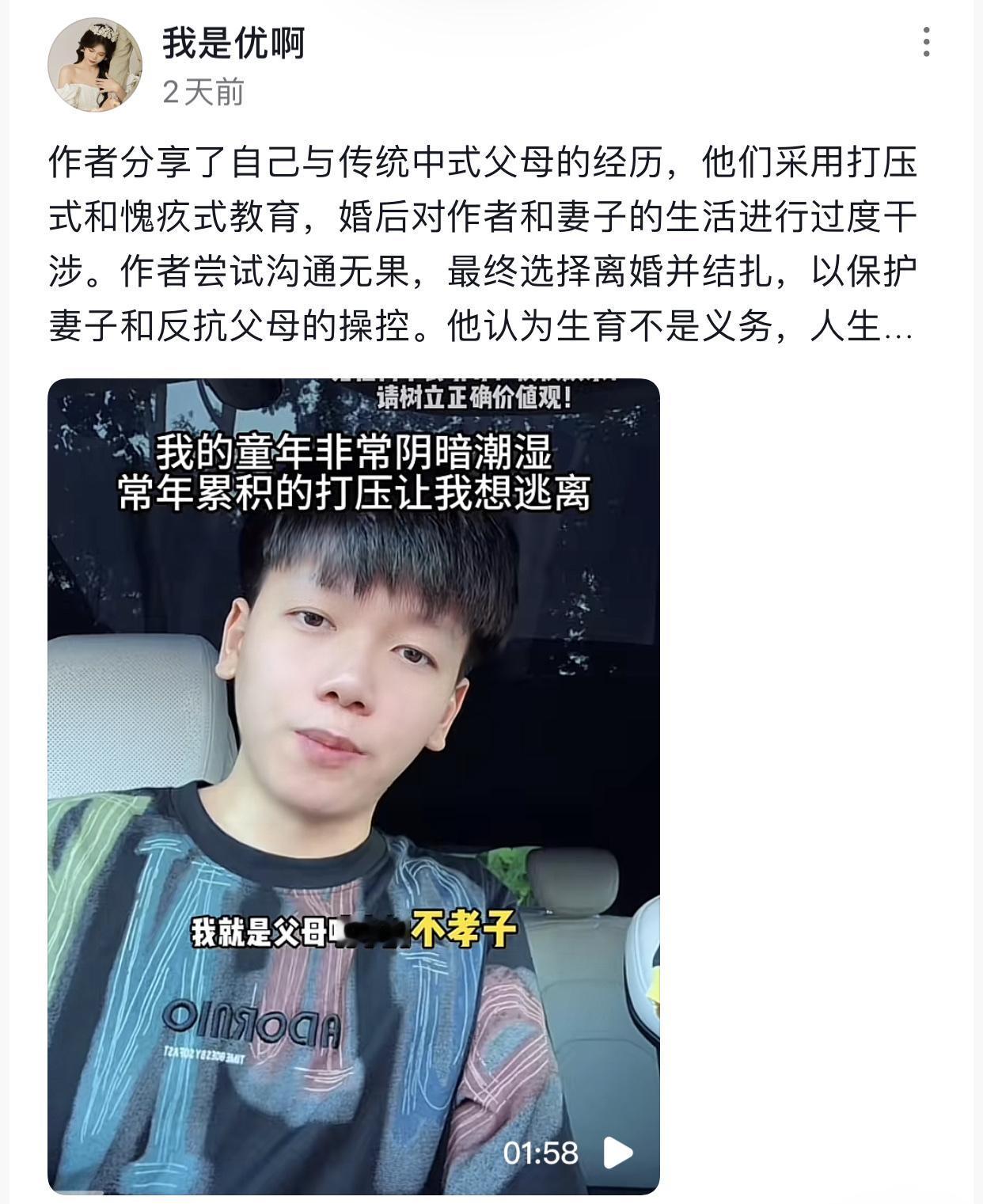 身为独生子却结扎丁克跟父母断绝关系,为老婆和家族所有亲戚长辈翻脸,这才是2025年最有种的男人。 起因是一博主自述说自己父母是很典型的中式家长,从小对自己进行打压式、愧疚式教育,动不动就对其进行混合双打,无论他做什么从来不会夸他,经常当着亲戚面全方面贬低他,来抬高他们自己。时常告诉博主说他们赚钱有多么辛苦、做家务有多么辛苦,而他们这么辛苦一切都是为博主,他们把博主养的这么大博主就是欠他们,所以博主一定要孝顺他们。 更过分的是他们在博主结婚时,从摆几桌酒到穿什么衣服,都要严格把控。结婚后他们更是搬入博主家和博主一起生活,对他的生活指手画脚,隔三差五喊一堆亲戚回家,进门就让博主老婆端茶倒水做饭伺候他们,甚至通过给邻居、物业发红包的方式监控他和妻子的行踪,从早上几点起床到晚上几点熄灯睡觉,再到家里有没有来朋友统统都要知道。老婆对他们毕恭毕敬孝顺换来的却是手脚相向。 博主跟他们沟通了无数次,但是他们都是今天答应,明天又继续老样子。见实在无法沟通,最终博主为了保护老婆,选择和老婆离婚,和老婆保持恋爱关系,这样就算父母想找茬也找不到老婆头上。做为独生子的他更是直接跑去医院做结扎手术,然后把报告群发给所有亲戚,更是宣布和父母断绝关系,拉黑所有亲戚的联系方式。 对此你们觉得博主这样做的对吗?