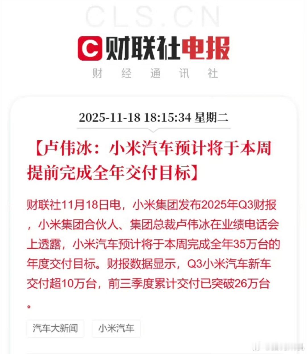 小米本周就能完成全年交付目标了,年初还在质疑的声音十月份后就基本看不到了,因为他们真的知道你能达到目标了。