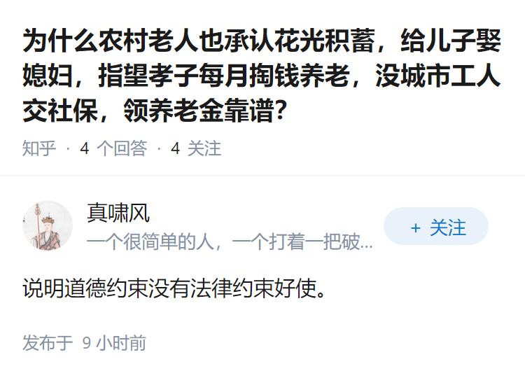 为什么农村老人也承认花光积蓄,给儿子娶媳妇,指望孝子每月掏钱养老,没城市工人交社保,领养老金靠谱?