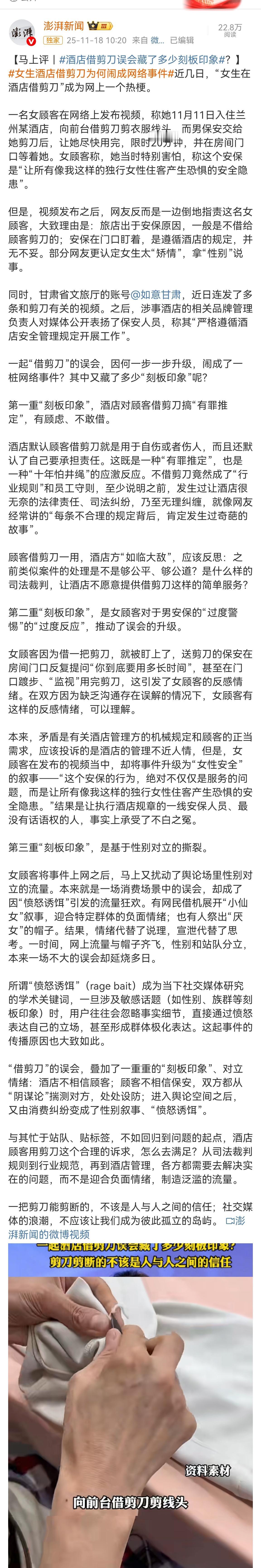 酒店剪刀事件,最应该反思的是媒体。 就是这些媒体人,人家酒店和保安没错的情况下还能无理赖三分。 可以想象一下,如果因为此剪刀发生什么伤害事件,酒店和保安将会面对什么样排山倒海的舆论环境。 每一个规定后面都有一大堆血淋淋的教训。 换位思考,女顾客借剪刀剪线头却不愿意当面剪,这就等于剪刀要与酒店人员分开。 保安问使用时间,女顾客给不出具体时间,这时安保选择到客房门口并不时与女顾客问话,是非常专业行为。 因为留在门口,可以保证女顾客没有带剪刀外出。而不时询问,是确认女顾客在房间里是否安全状态。 但即便如此,媒体人还能鸡蛋里面挑骨头。 女生酒店借剪刀藏了多少刻板印象? 但凡媒体舆论环境好一点,酒店也不会如此胆战惊惊小心翼翼。