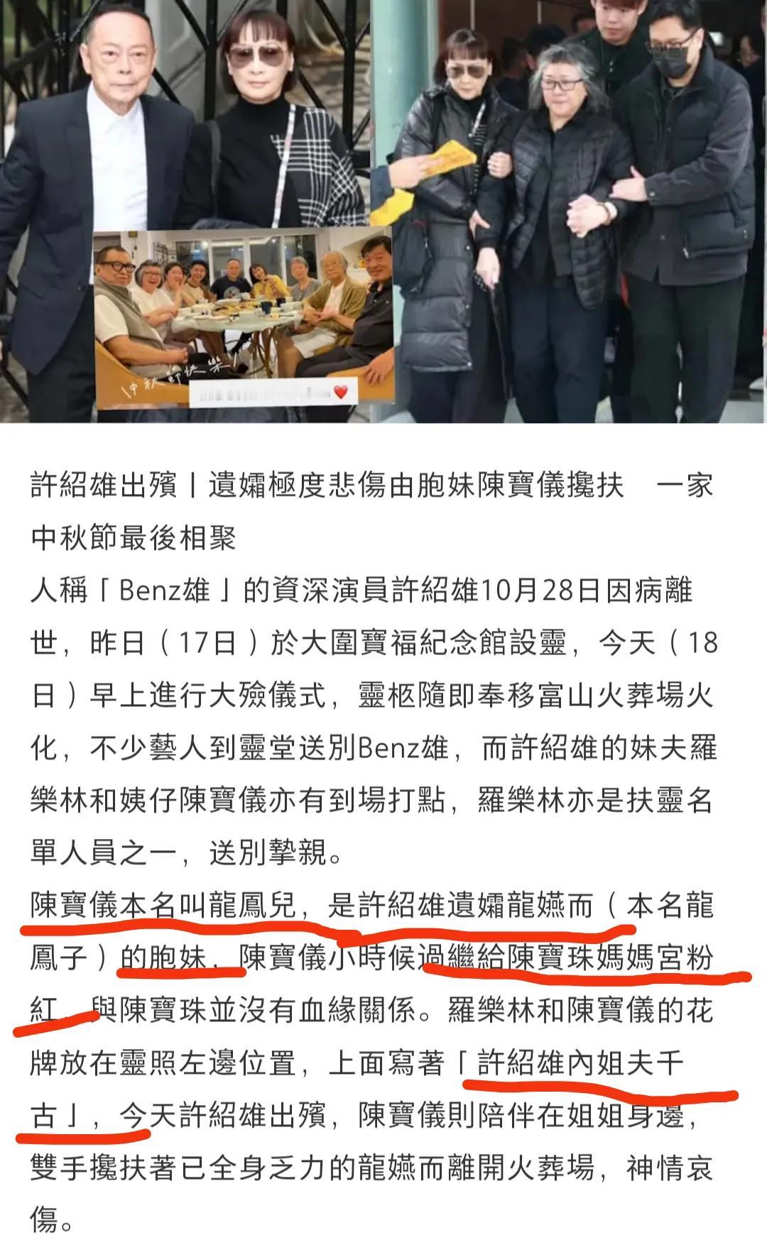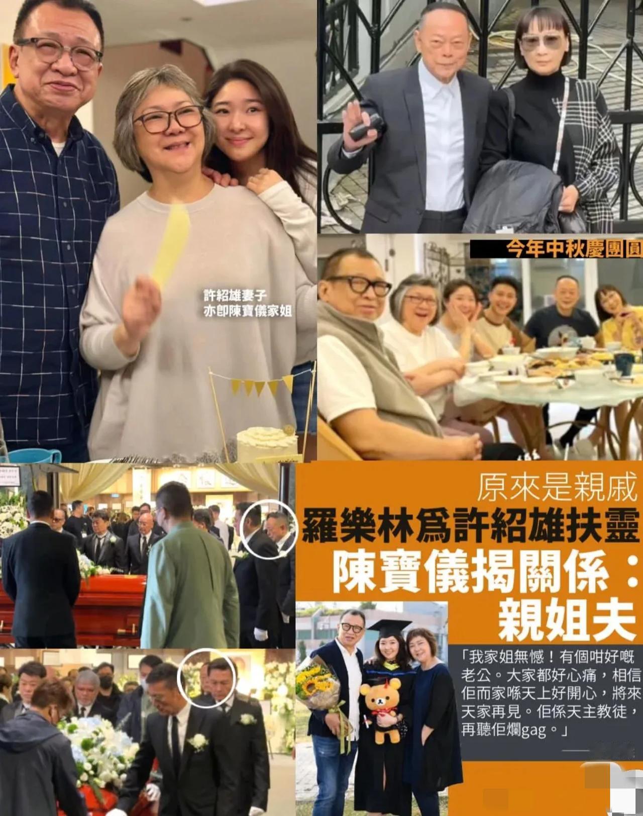 原来他们是连襟,隐藏太多年了! 11月18日,据港媒报道,香港演员许绍雄出殡,众星纷纷现身灵堂悼念。罗乐林与妻子陈宝仪的出现,意外揭开两人与许绍雄夫妇的真实关系。 陈宝仪年轻时是一名演员,先后效力过亚视和TVB,参演了《壹号皇庭》《我本善良》等经典剧集。直到嫁给罗乐林,她才淡出娱乐圈,专心相夫教子。 港媒爆料称,陈宝仪原名龙凤儿,是许绍雄遗孀龙嬿而(原名龙凤子)的亲妹妹。她很小的时候,便被过继给陈宝珠的养母宫粉红。至于过继的原因,没有详细说明。 过去多年,陈宝仪只提及过陈宝珠是自己姐姐,没公开透露过许绍雄是自己姐夫,因此外界压根不知道她与龙嬿而才是亲姐妹。 姐夫许绍雄离世,罗乐林陈宝仪显然很难过,罗乐林作为扶灵人之人,送许绍雄最后一程,陈宝仪则帮忙安慰姐姐。 陈宝仪受访时承认许绍雄是自己姐夫,并大赞许绍雄是200分好爸爸,300分好女婿。不仅对她姐姐以及外甥女很好,还爱屋及乌疼爱她的爸爸妈妈、外甥(龙嬿而与前夫之子)。 一直忙着在内地工作的陈志健(罗乐林前女婿),也赶回港送别许绍雄。据了解,他虽然跟罗乐林女儿离婚了,但与对方家族始终保持良好关系,之前还到许绍雄的豪宅聚餐。此次现身,他神情哀伤,看得出来很伤心。