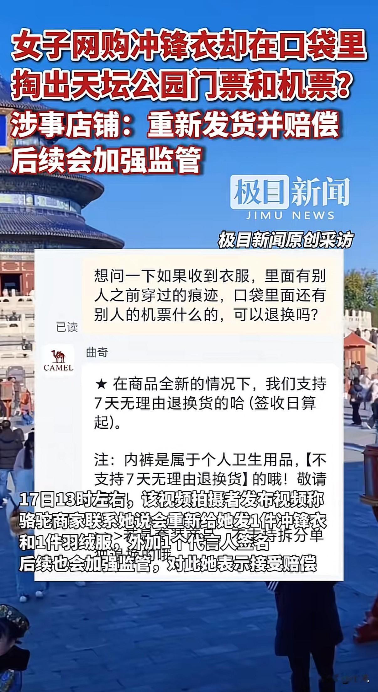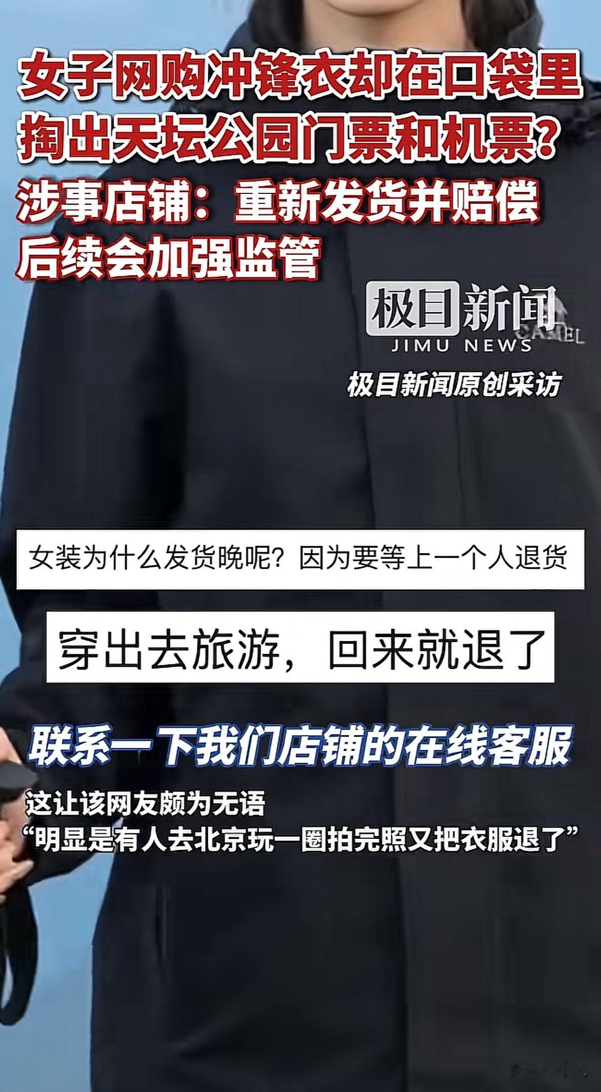 新买的冲锋衣,吊牌还在。手伸进右边口袋,摸到东西。 一张天坛公园门票。日期:11月2日15:49。 再掏,是两张机票。北京飞杭州,MF8130航班。名字很清楚:倪某某,陈某。 还有行李托运单,用过的纸巾。 这些都在新衣服的口袋里。 视频里,她把东西一样样摆在桌上。机票,门票,纸片。全是陌生人的北京旅行记忆。 骆驼客服后来联系她:"补发一件冲锋衣,一件羽绒服,加代言人签名。"她接受了。 电商客服说:"七天无理由退货要商品全新,无使用痕迹。" 但这件衣服明显被人穿去旅行过。 黑色冲锋衣挂着吊牌,看起来全新。可口袋里装着另一个人的生活痕迹。 从11月2日到网友收货,不到半个月。这件衣服经历了退货、重新发货,没人检查口袋。 现在很多商家用巨型吊牌防退货。A4纸那么大,穿着不舒服。但没人好好检查退货衣服的基本情况。 想象上一个主人:穿着游天坛,坐飞机,可能还在西湖边拍照。然后退货。仓库收到,摸摸吊牌还在,直接当新品卖。 检查成了走过场。 如果网购连基本的新品保证都做不到,确实让人想去实体店。 在实体店,你能翻开每个口袋,对着光检查线头,试穿合适再买。那件衣服,从你看到那一刻起,就只属于你。