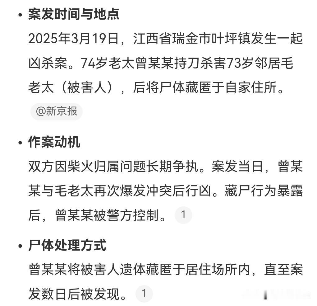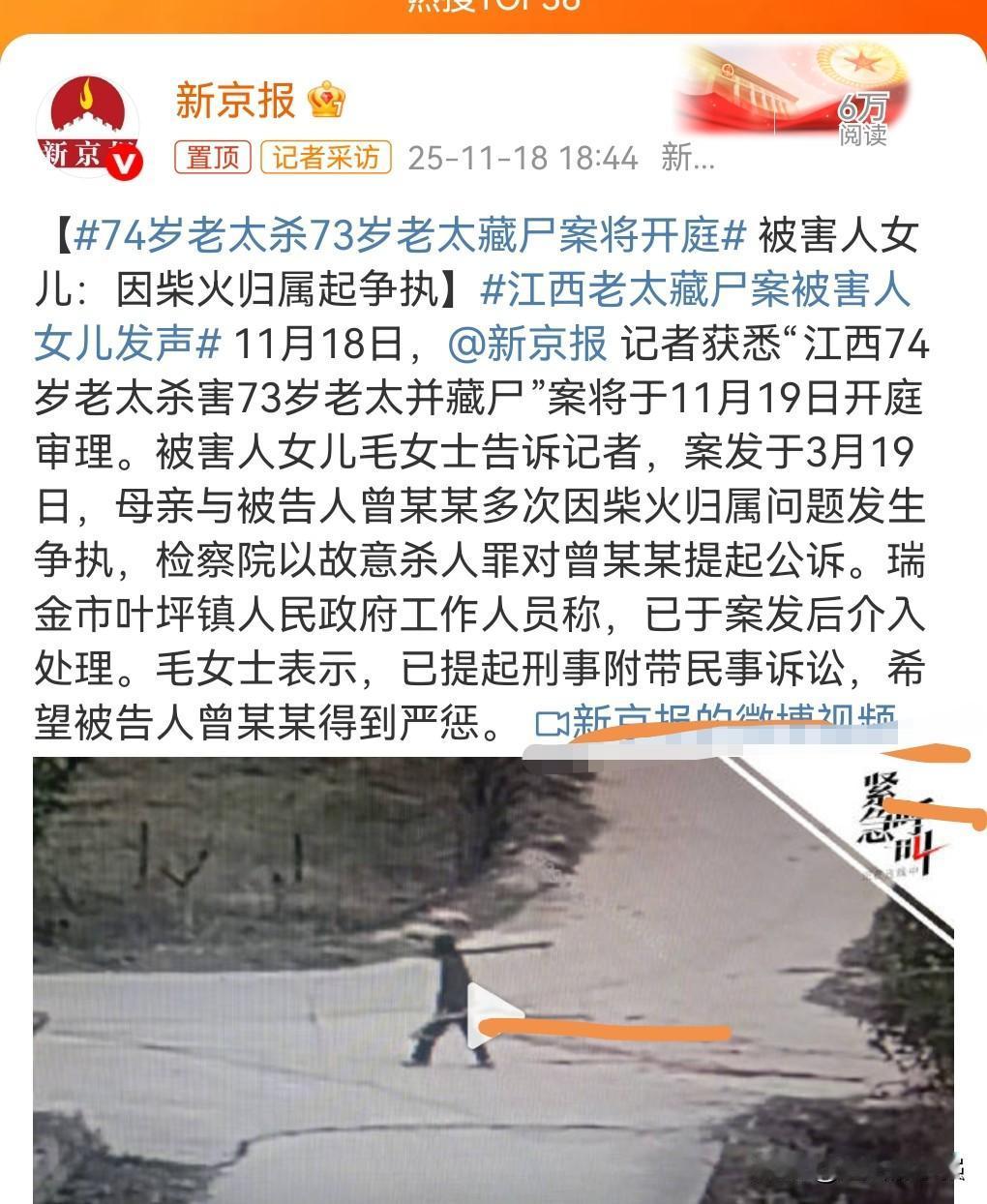 人为什么会那么冲动呢? 生起气来竟然能够干出杀人的事。 74岁老太杀73岁老太藏尸案将开庭。 案发于今年3月19日。 因为柴火的归属问题,双方发生争执酿成命案。 并且凶手还藏尸。 既然是杀人罪,这么大年纪了,那就应判个死刑,早日执行吧。