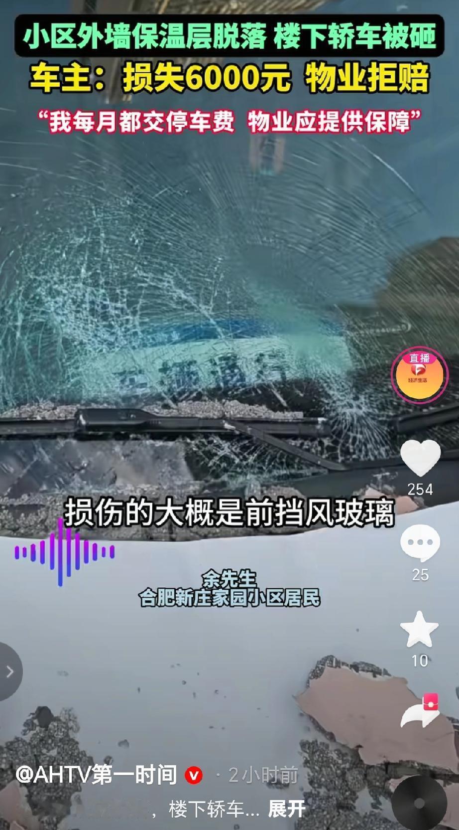 2025年11月17日上午,安徽合肥新庄家园小区业主余先生发现停在楼下的轿车被小区外墙脱落的保温层砸坏,前挡风玻璃和引擎盖受损,造成车辆损失约6000元。事后余先生也是联系物业进行索赔,余先生每月向物业缴纳80元停车费,认为物业应保障车辆安全,要求物业赔偿,但物业明确拒绝。余先生表示若协商不成,将通过起诉解决。(来源于@AHTV第一时间)