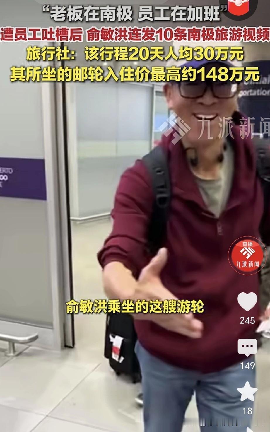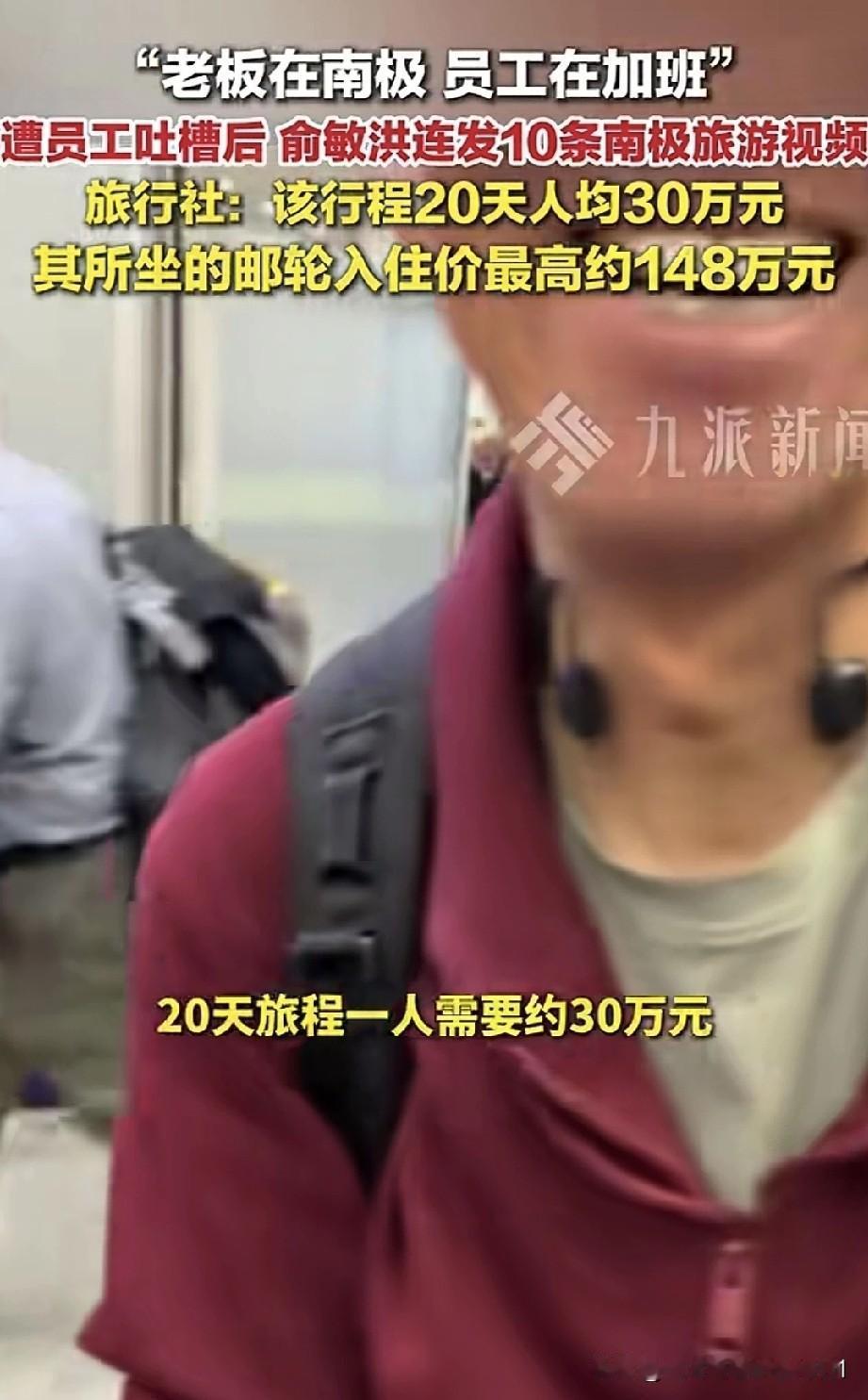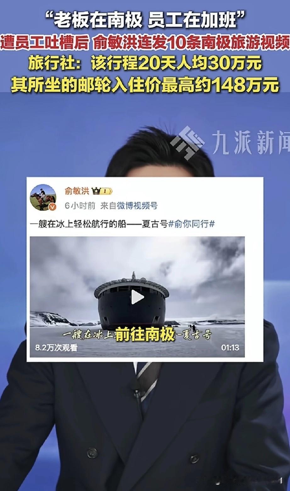 俞敏洪去南极遭员工吐槽,老板在南极旅游,员工在加班。 这老板有啥问题吗?要是不存在压榨劳动力,工资也没少给你,那就挺好。难不成还指望老板陪你加班?这员工怕是不想干了,你还能管老板的事?你就安安心心上你的班,不想干就走人,中国最不缺的就是人。人家自己挣的钱,爱怎么花就怎么花,有毛病吗?这员工也是无理取闹,老板凭什么要陪你加班,老板只要按照劳动法给你发工资就行。大家各干各的活儿,人家拼搏奋斗的时候你都还没出生呢。你工作拿的是工资,做好本职工作是应该的。你要是心里不平衡,大可以离职。我不偏向谁,就是这么个理儿!