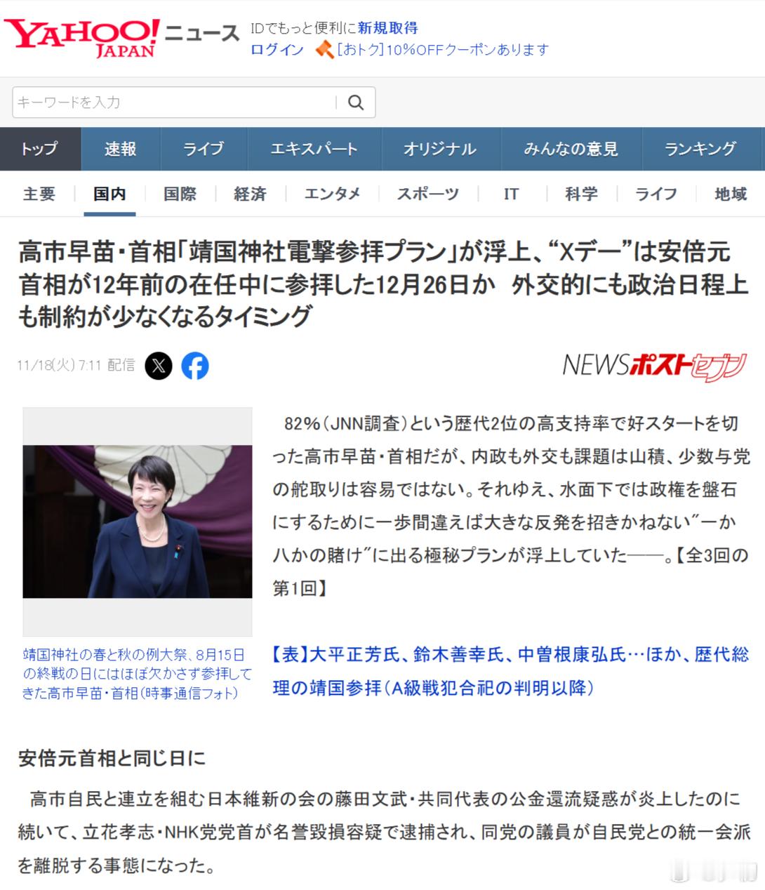 雅虎(日本)新闻:日本首相高市早苗的“突访靖国神社”计划浮出水面。可能是12月2