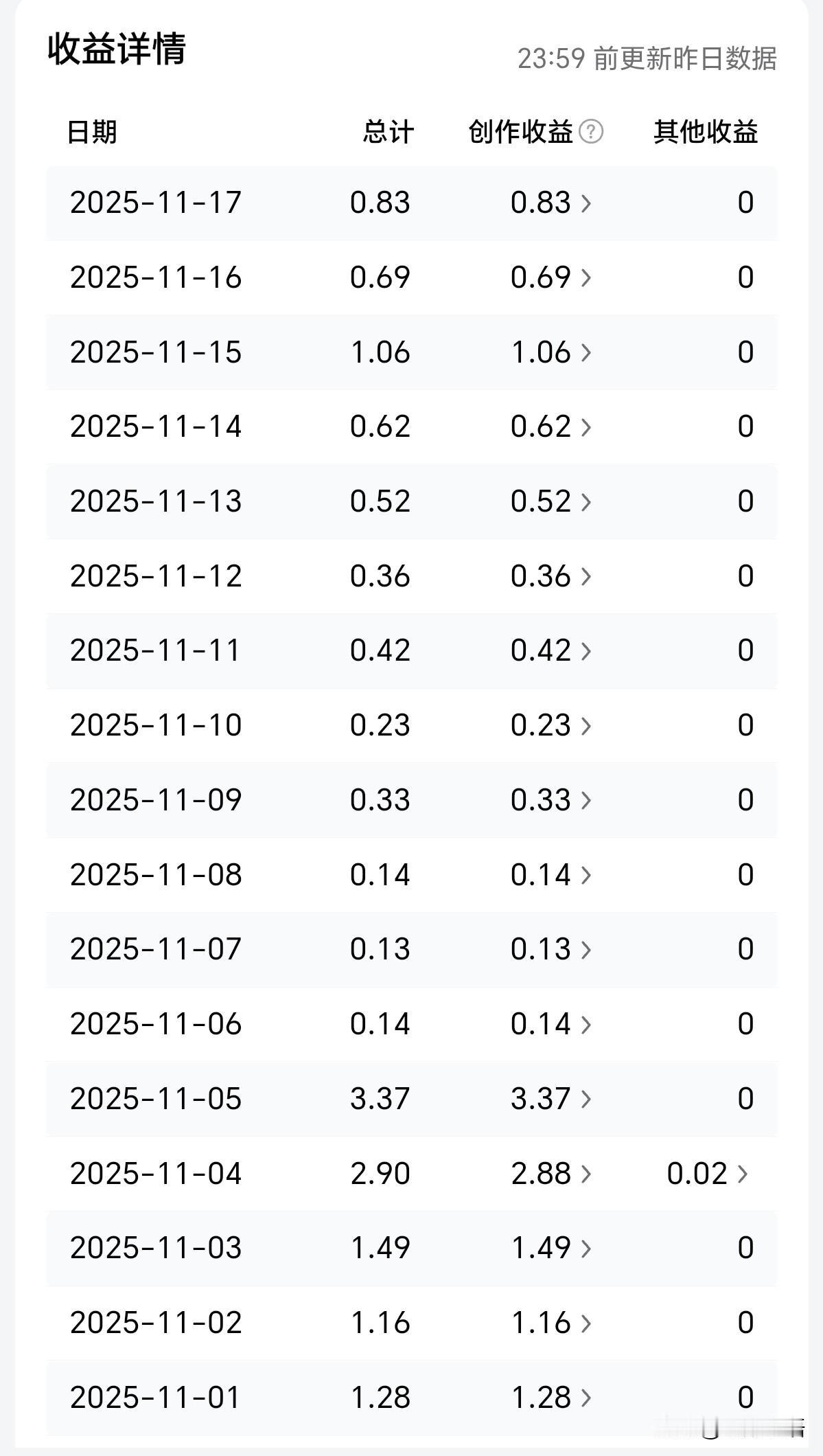 “90%的作者在头条都是炮灰”,当我看见这句时,吓了一跳! 事实证明,我就是那个炮灰! 来头条2个半月了,最近每天才有几毛一块多的! 那些10W,50W,甚至100W的爆款,他们是怎么做到的? 不是不赚钱,是因为“你的努力,都用错了方向”! 方向都错了,你的努力除了感动自己,还有什么用!这话戳心吧! 都做了些无用功! 是不是很多小伙伴都有同感,发出去的就几十几百个展现,阅读点赞都是大鸭蛋? 最近我的一篇图文,给我推流了近八十万展现,十三万阅读,近七百评论! 我就在每一个点赞,每一条评论下都做了认真的回复! 果真还是有效果,有了互动,有了粘性,自然就有流量了! 每天收益虽然不是很多,这也是平台对我的一种鼓励! 写作不只是写感动自己的事情,更重要的是利他,初学者更要去向有结果的人学习!去拆解,去模仿! 坚持更新 !做到不抱怨 的心态,那么这种持久的坚持,缓慢的前进! 就是最快的方法! 期待下一次的分享已经脱贫,摘掉“炮灰”的帽子!