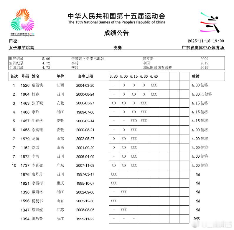 全运田径这个项目爆冷到极端 所有争牌热门全部无缘前三甚至没成绩 下雨降温专挑狠人下手?甚至情愿给队友打伞也不比赛!11月18日晚,全运会田径大项结束女子撑杆跳决赛争夺,这场战况让人大呼意外,所有争牌热门全部无缘前三!今天比赛所在地下雨降温,对撑杆跳选手看来打击很大。安徽选手佘宸瑶只过了4米00,浙江选手戴雨格和江苏选手缪可妮,连4米00的起始高度都没过,直接无成绩。浙江队陈巧玲则没有出战。不过笔者注意到,陈巧玲现场给队友李玲打伞避雨。头号热门、安徽选手牛春格,4米15勉强第三次过,而后无法越过4米30,最终获得第四。两次获得全运冠军的36岁老将、浙江选手李玲也只过了4米15,最终获得第四。以上选手都具备底限4米40以上水平,无可争议的争牌领先集团。而最终获得前三名的,还都没有过4米30以上的成绩纪录。最后夺冠的是江西选手危菱侠,她连续一次过4米00,4米15和4米30,最终4米30获得冠军。四川选手杜睿也跃过4米30,创造个人最佳。她和危菱侠都没过4米40,但危菱侠一次过4米30,杜睿第二次过,这样杜睿获得亚军。19岁的安徽选手张子璇跃过4米15,因为她是一次过,战果好过李玲和牛春格,这样张子璇获得季军。
