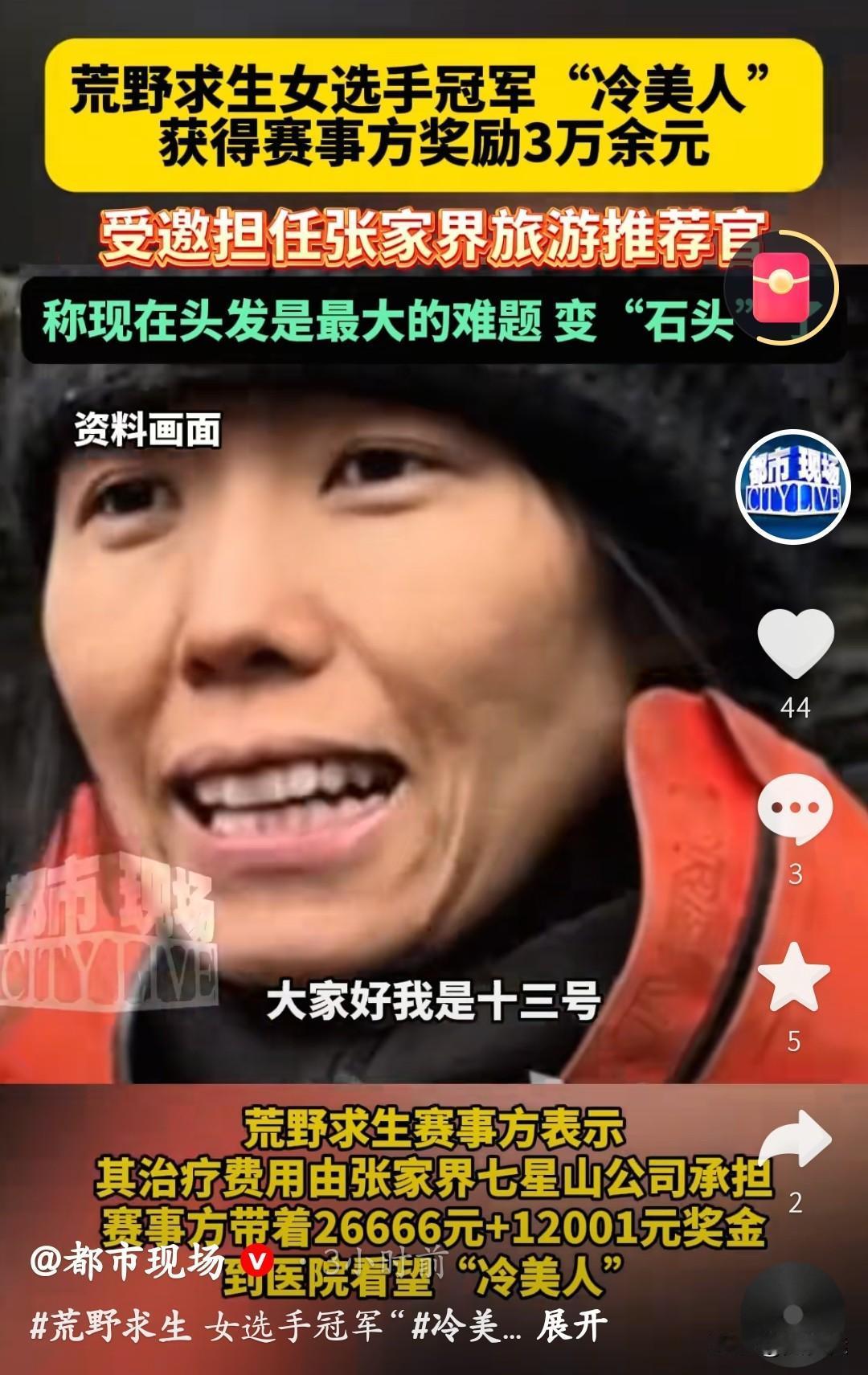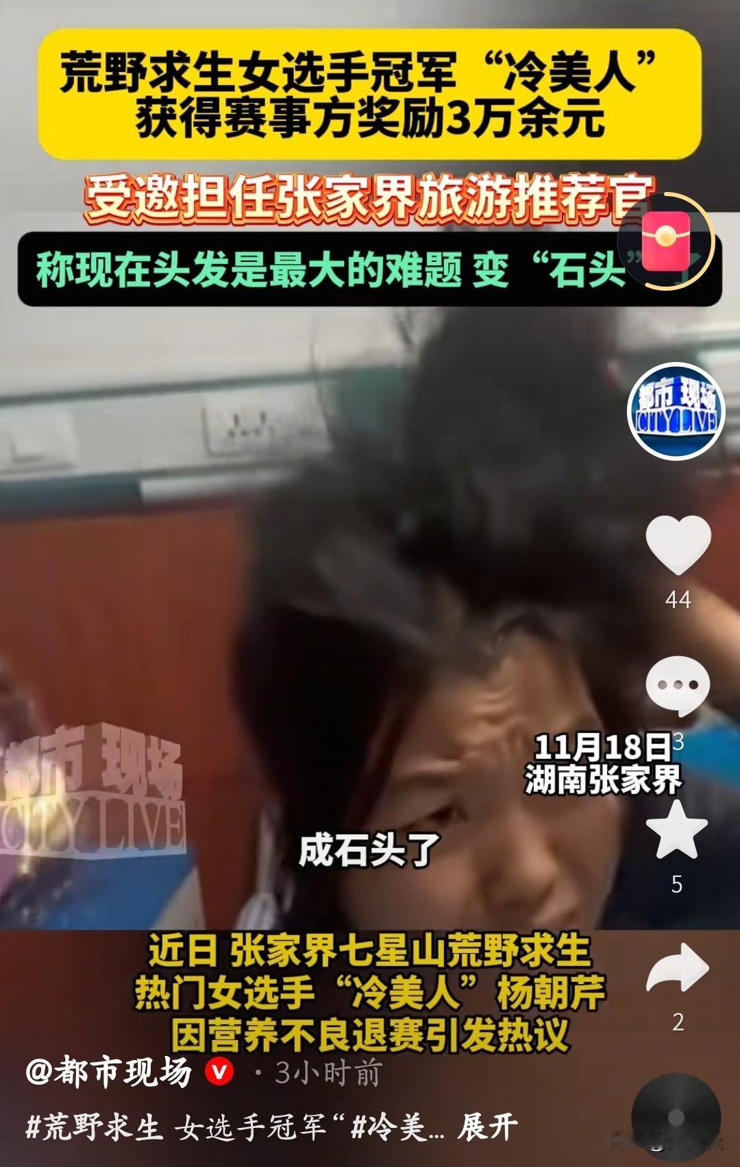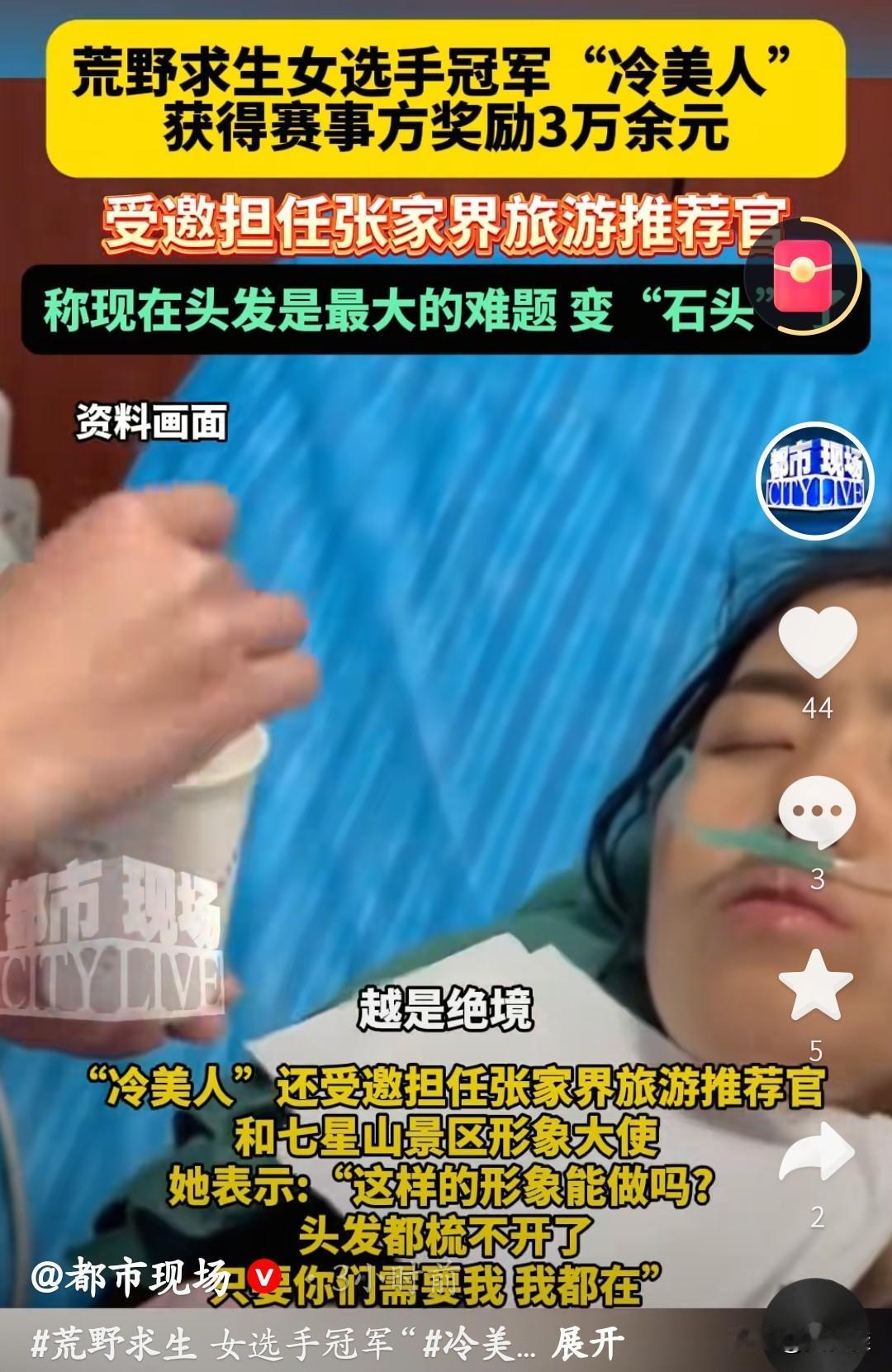 不过这姐姐也是真厉害——先是在张家界七星山荒野求生里拿了冠军,拿了3万多奖金,结果因为营养不良进了医院,赛事方还包了治疗费,带着钱去探望。现在人还在恢复呢,又被邀当张家界旅游推荐官、景区形象大使,她还耿直吐槽“这头发都梳不开,这形象能行吗”,但转头又说“只要需要我都在”,又飒又暖。 荒野里能扛住饿肚子拿冠军,出来了却被头发难住,这反差也太真实了!希望姐姐赶紧把头发“抢救”回来,养好身体,到时候美美当推荐官!