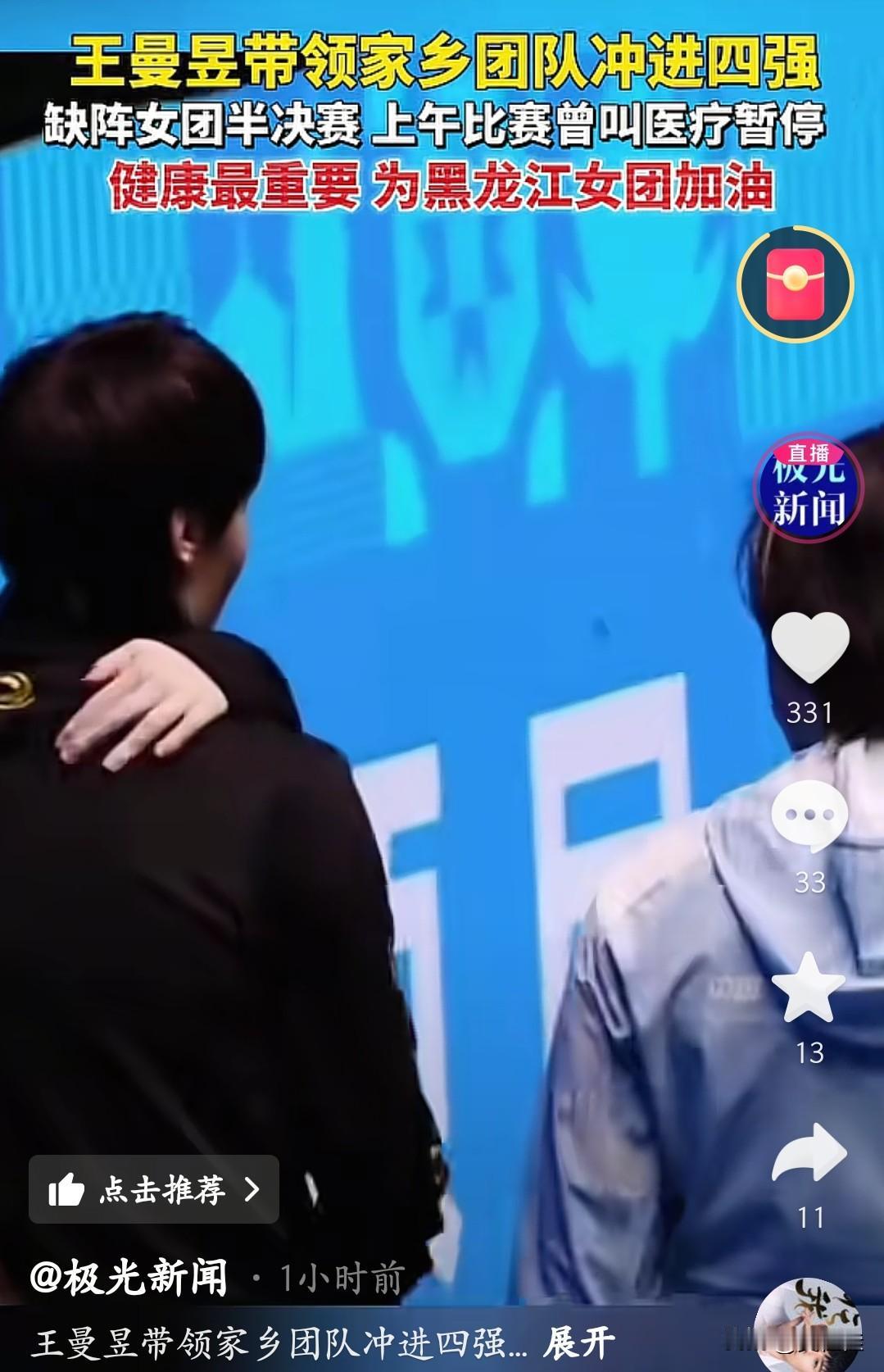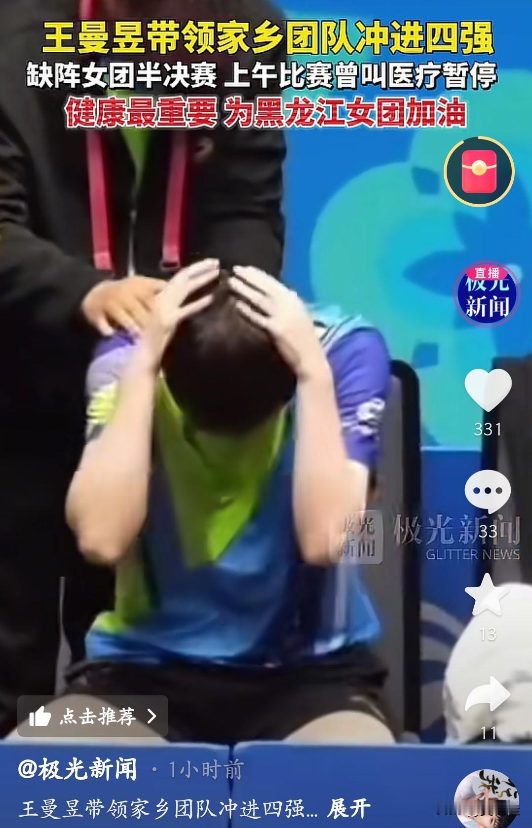 上午比赛就看她叫了医疗暂停,现在看她走路都得手扶着肩膀,那姿势看着就疼。明明刚带着家乡队冲进四强,正是拼的时候,身体却扛不住了。 运动员真是太不容易了,赛场上看着飒爽,背后全是伤病。希望她好好养伤,身体比比赛重要!曼昱,身体是最重要的,撑不住的时候,不要强撑,不要太逼自己!希望曼昱早日康复!