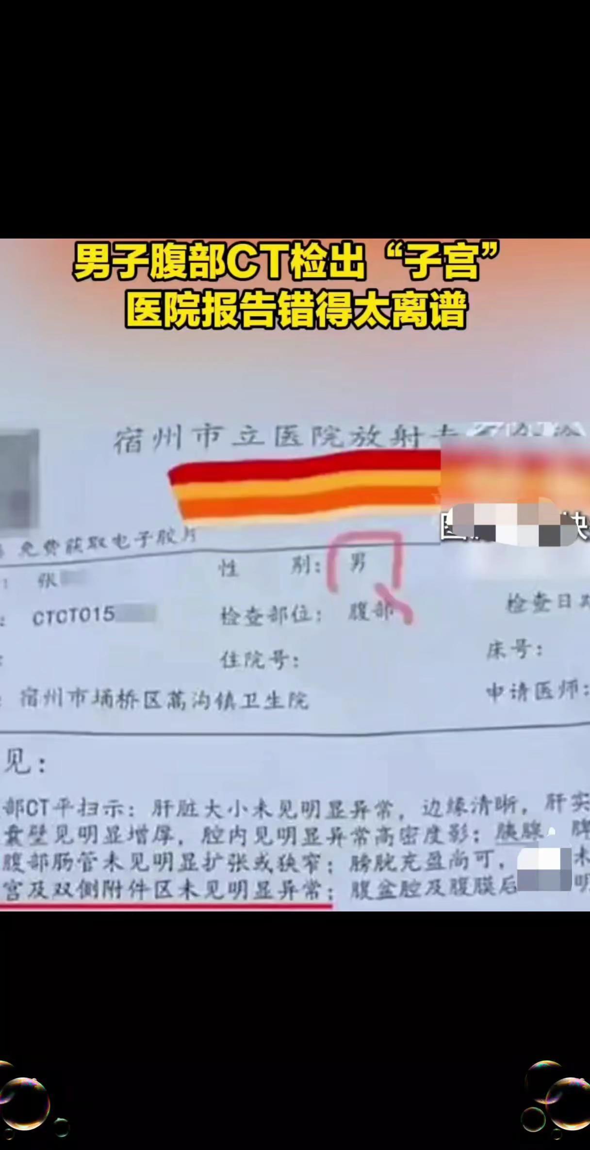 男子拍CT查出子宫!医院犯低级错,医生停。男子拍CT查出子宫!医院犯低级错,医生停职网友怒了 这事儿简直离谱到没边!安徽一男子拍腹部CT,报告上竟写着“子宫及双侧附件区未见异常”,一个大老爷们被查出子宫,医院这操作直接把人看傻了! 11月17号,宿州市立医院终于发了通报,承认报告出了低级错误,还把涉事医生和科室主任停职调查了。可这道歉和处理,根本平息不了大家的怒火,毕竟这错犯得也太不应该了! 男子自己发帖吐槽,说拿到报告时直接懵了,自己一个纯爷们,怎么就查出子宫了?他质疑医院检查不负责任,拿着患者的健康当儿戏,这话说出了多少人的心声。 网友们看完直接炸了,有人调侃“这医院是开了天眼,能查出男人没有的器官”,更多人则愤怒地说“连男女都分不清,这样的医生配穿白大褂吗?”“这要是误诊了大病,谁来负责?” 其实这根本不是什么小错误,而是医院制度落实不到位、医疗质量管理不规范的铁证。一份CT报告,从检查到出结果,至少要经过医生诊断、审核等环节,这么多道关卡,居然没一个人发现问题,简直匪夷所思。 “健康所系,性命相托”,医生手里握着的是患者的生命,哪怕是一个小小的报告错误,都可能给患者带来巨大的麻烦。要是这男子真因为这份错误报告耽误了病情,后果不堪设想。 之前也有医院出过错,但这么低级的错误还是头一次见。这说明涉事医院的医生工作态度极其敷衍,根本没把患者的健康放在心上。拿着高薪,却干着不负责任的事,这样的医疗服务谁能放心? 患者去医院看病,是出于对医生和医院的信任。可宿州市立医院的做法,彻底辜负了这份信任。一个连性别都能搞错的医院,怎么可能在诊断病情时做到精准无误? 现在大家最担心的是,这样的错误是不是只是个例?还有多少患者拿到的是错误的检查报告?医院不能只停职两个人就完事,必须彻底整改,查明问题根源,避免以后再出现类似的荒唐事。 医疗质量是医院的生命线,也是患者最看重的东西。如果医院连最基本的报告准确性都保证不了,那还谈什么救死扶伤?这样的医院,迟早会被患者抛弃。 希望其他医院能以这件事为警钟,加强医疗质量管理,严格落实各项制度,对医生进行严格培训,杜绝类似的低级错误。毕竟,患者的健康容不得半点马虎,每一份报告都必须做到准确无误。 涉事医生和主任被停职是咎由自取,他们必须为自己的敷衍和不负责任付出代价。但更重要的是,医院要以此为契机,进行全面整顿,重建患者对医院的信任。 说到底,医疗无小事,责任大于天。医院和医生必须时刻保持敬畏之心,认真对待每一位患者、每一份报告。只有这样,才能真正做到“健康所系,性命相托”,让患者放心地把生命交给他们。