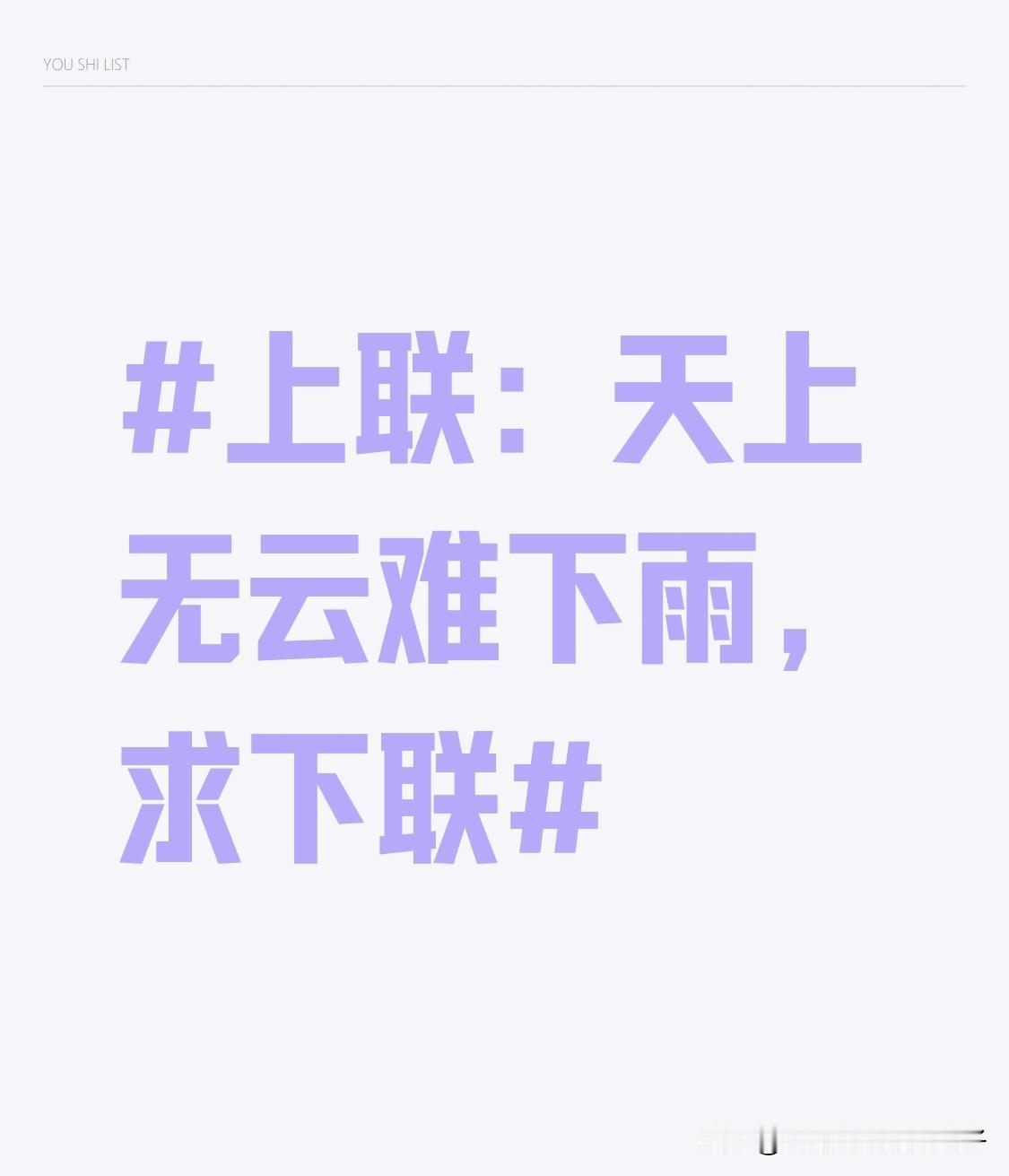 看到“天上无云难下雨”这个上联,一下子就来了兴致。从自然气象角度,“地中有水方成流”就很不错,天上云与雨关联,地下水与流呼应,天地相济构成自然运行规律。 从人间社会层面,“人间有善易生和”也超棒,自然条件影响降水,人间善良能带来和谐,天人共泰寓意美好。要是从人生哲理来说,“心中有爱易行善”也很妙,客观条件是事情前提,主观有爱更易行善,德善同行很有深意。不得不说,对对联太能展现文字魅力了。