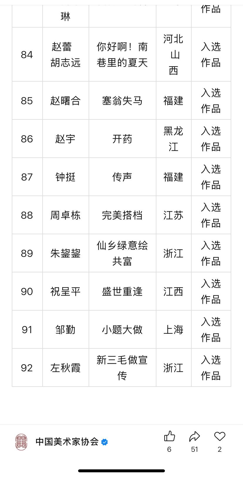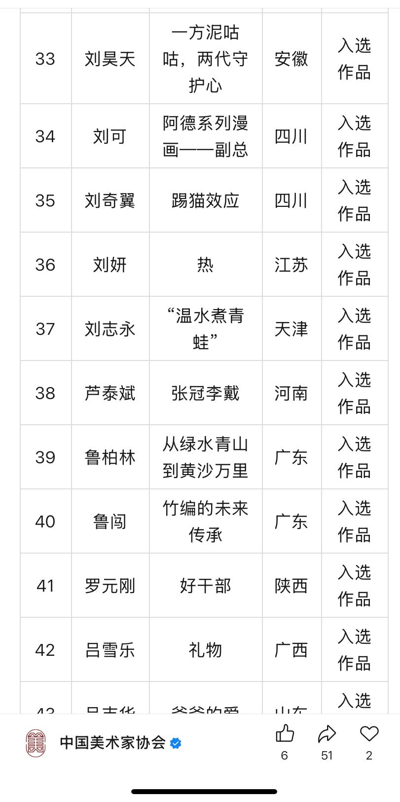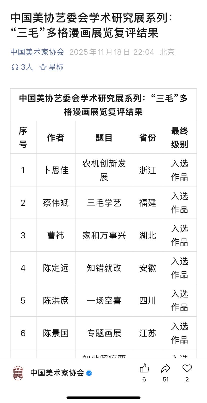 成功解锁“三毛杯”!中美协漫画赛类的子恺缘、桐乡廉政漫画、三毛杯、幽默画大展都解锁了。继续努力,还有全国美展漫画、漫画届展两个重中之重要冲啊!感谢师友们的支持。三毛杯初评238人,复评92人,入展率只有39%.很残酷。中国美术家协会